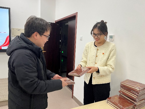 会后,国产探花 2022级博士生党支部书记李祥园向支部成员分发理论学习笔记本。