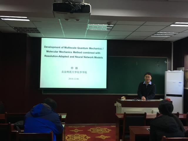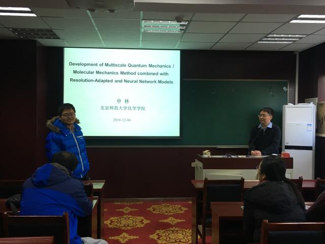 申林博士2018年9月年入职国产探花 ,主要研究兴趣包括量子化学从头算、分子动力学以及复杂化学体系的多尺度模型,近年来发展了基于量子力学/分子力学、全原子/粗粒化分子力场、以及增强采样和机器学习技术的计算方法,取得了一系列的研究成果。申林老师结合自身的科研经历,做了题为“Development of Multiscale Quantum Mechanics/Molecular Mechanics Method combined with Resolution-Adapted and Neural Network Models”的主题报告,报告深入浅出、内容丰富而详实,引起了相关领域研究工作者和研究生的极大兴趣。随后,申林老师与在座师生进行了热烈的讨论并就相关问题进行了深入的交流。