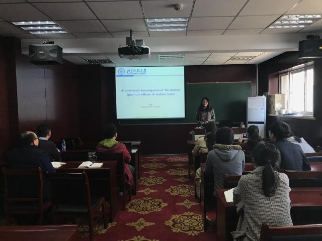 郭静教授2018年入职国产探花 ,主要从事基于扫描隧道显微镜/qPlus非接触式原子力显微镜的表面物理化学研究。近年来在尖端扫描探针技术的发展、表面水/冰的亚分子级分辨成像、质子转移动力学、核量子效应(量子隧穿和量子涨落)对水的氢键网络、氢键强度甚至表面异质催化的影响等方面取得一系列优秀的研究成果。郭静老师结合自身的科研经历,做了题为“Atomic-scale investigation of the nuclear quantum effects of surface water with STM/AFM”的主题报告,报告深入浅出、内容丰富而详实,引起了相关领域研究工作者和研究生的极大兴趣。随后,郭静老师与在座师生进行了热烈的讨论并就相关问题进行了深入的交流。