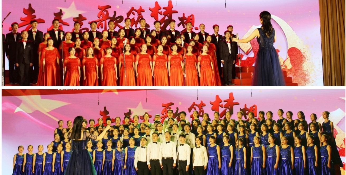 在第一篇章,由2018级合唱队带来的歌曲《告别》唱出红军勇往直前的坚定和无畏,更唱出人民对红军的不舍与期盼!由2017级1、2班联队的带来的歌曲《唱支山歌给党听》和2016级3班合唱队演唱的《在太行山下》,用充满朝气的旋律唱出庄严肃穆的民族之魂。