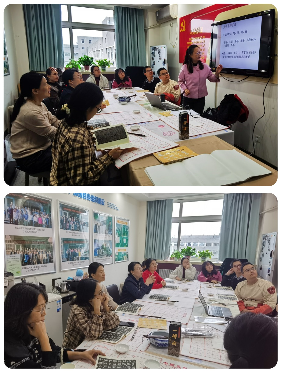 课程伊始,韩彩莹老师以“温故知新”为起点,系统回顾了上节课的核心书法知识与基础技法,帮助学员们查漏补缺、巩固根基,为后续学习做好充分铺垫。随后,韩老师带领大家开启“汉字时光之旅”,从甲骨文的古朴灵动到金文的厚重沉稳,从小篆的规整匀称到隶书的端庄典雅,生动梳理了汉字的演变脉络,让老师们在追本溯源中深刻领略中华文字的深厚底蕴与独特美学。在精进笔法环节,韩老师聚焦竖画与撇画的核心技法,从起笔的轻重、行笔的力度到收笔的顿挫,进行细致示范与手把手指导。老师们凝神静气、提笔临摹,在一笔一画的练习中体悟笔画的韵律与劲道,逐步掌握两种基础笔画的运用技巧,书写作品也更显神韵与风骨。