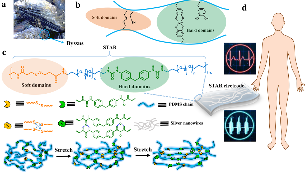 图一.瓣鳃类动物启发的用于电生理的表皮电极示意图。(a)一只贻贝通过其足丝附着在另一只贻贝上面。(b)瓣鳃类动物足丝软硬部分的化学结构。(c) STAR的化学结构和拉伸后的两个动态键变化。(d)电生理信号监测的示意图。