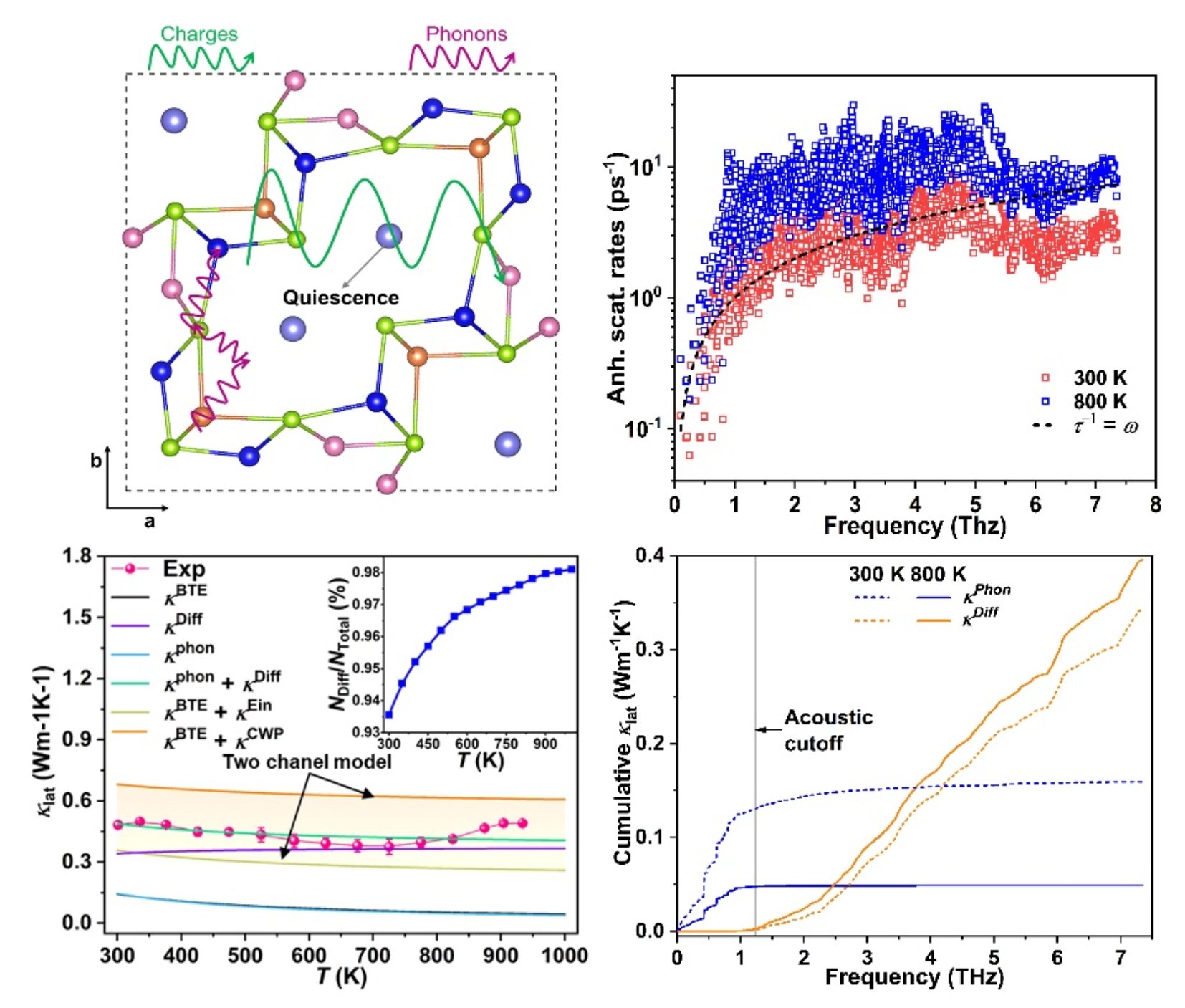 吴立明老师和陈玲老师课题组成功获得具有高非谐性、低晶格热导率的热电化合物四方晶系KCu5Se3。在前期对1:4:3和1:5:3两例密切关联却又不尽相同的硒化物详尽晶体结构-热电性能关系研究基础上,该工作进一步通过晶格动力学研究,探明KCu5Se3的带间声子遂穿和横波声学声子定域化,使得该化合物具有较高的声子散射率和较低的平均自由程。研究表明,随着温度升高,KCu5Se3呈现低频声学模进一步软化、声学模和光学模耦合加强、声学声子色散减弱、以及三声子散射相空间不断增大等特性。此外,该化合物中K+离子振动表现了很强的频率依赖性。即,K+离子对中频声子有贡献,对高频和低频声子表现出近似静止的状态。这种“静止”的特点限制了K+离子和[Cu5Se3]-阴离子骨架之间的热流传导,进一步增强了正常声子之间的相互作用。利用双声子唯象方程,该工作定量地解释了KCu5Se3由扩散型声子(κDiff)和正常声子(κPhon)共同形成的格波输运方式(κtot = κPhon + κDiff)。其中,对于正常声子(κPhon)的长程热输运单模热扩散系数,利用Boltzmann输运方程可定量描述(