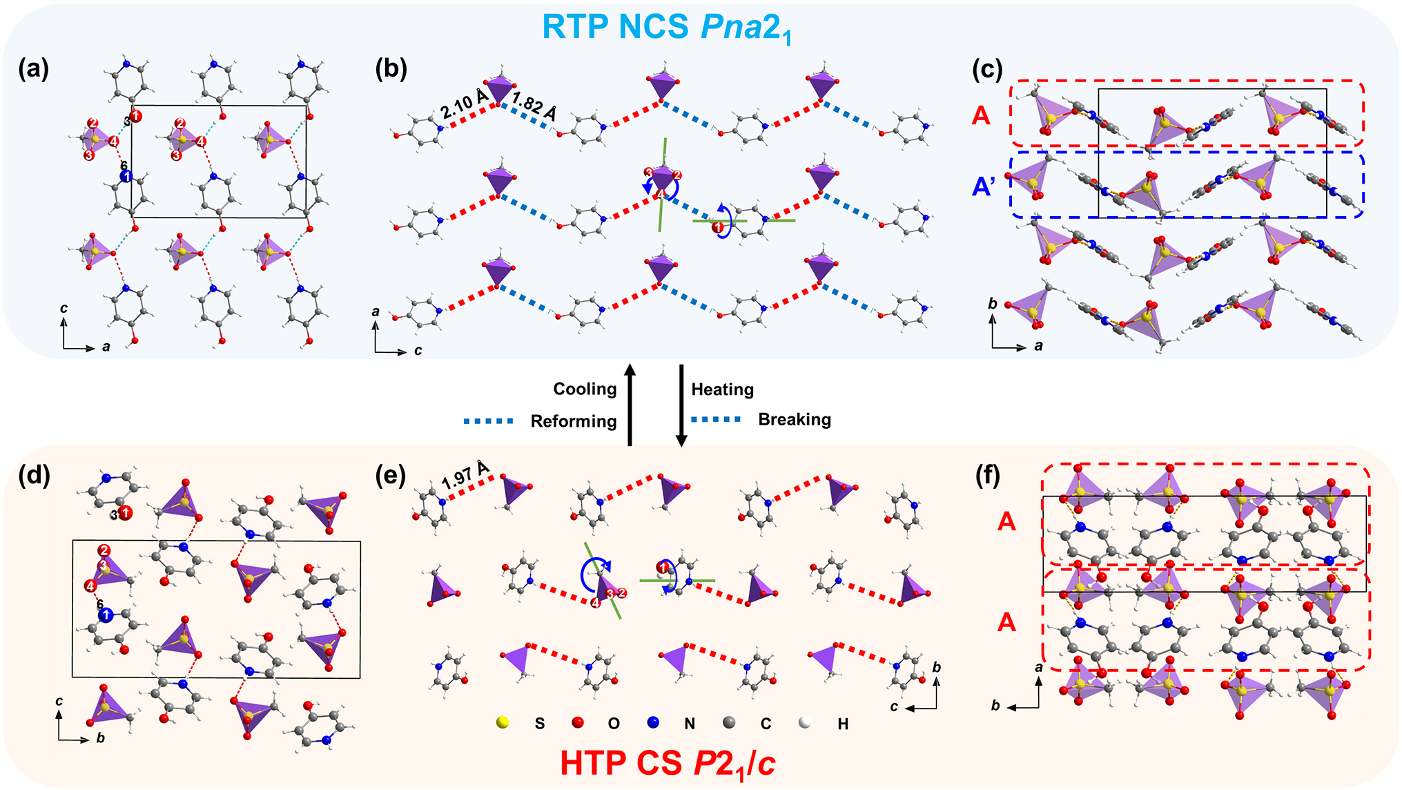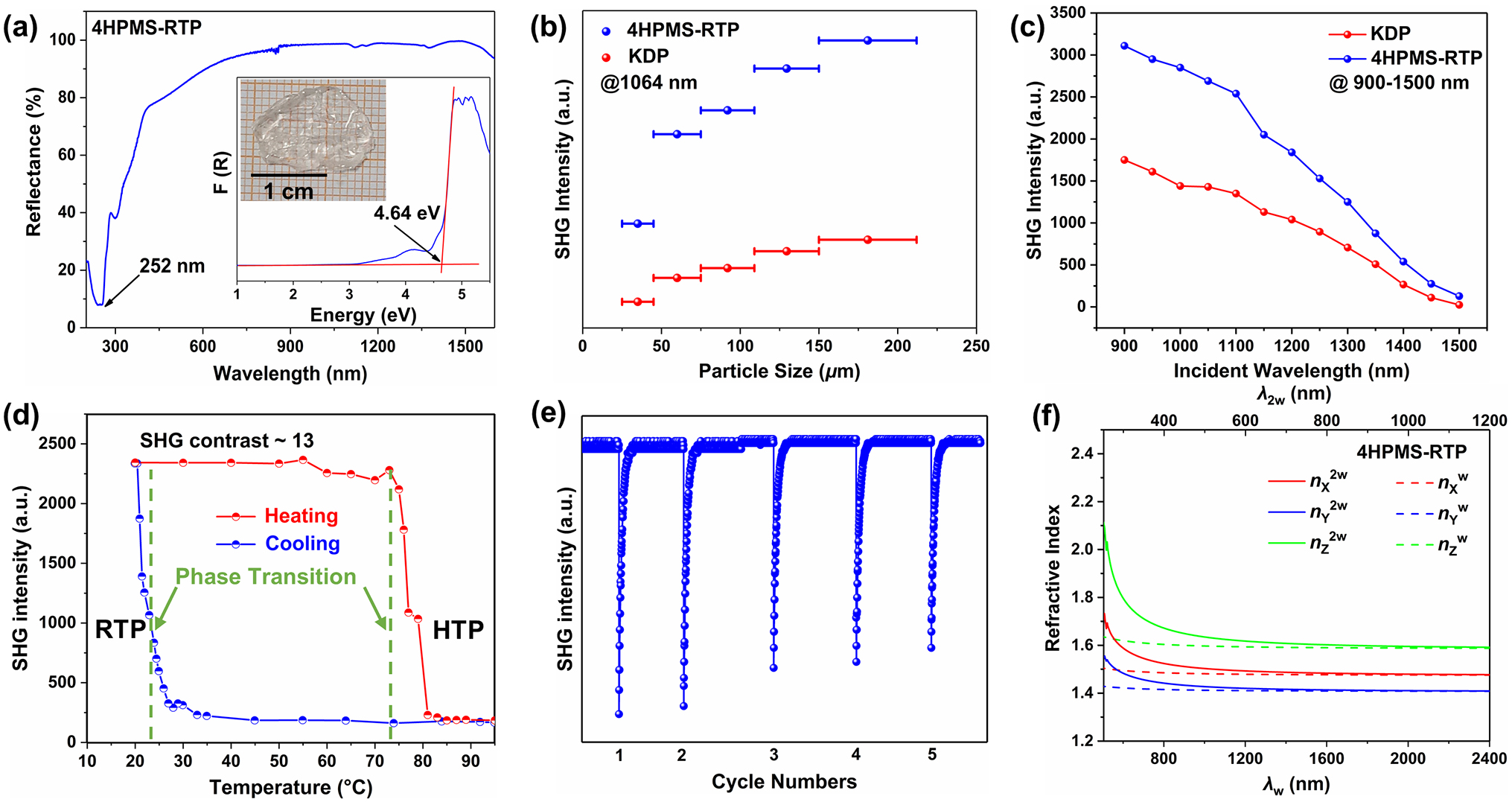 基于上述研究,近期他们发现热致NLO开关化合物,4-羟基吡啶甲基磺酸盐,((C5H6NO)+(CH3SO3)−,4HPMS)。其倍频效应达3.3 × KDP,为热致NLO开关材料的最大值。4HPMS还表现出高开-关对比度,及高激光损伤阈值(2.5 × KDP)。4HPMS晶体结构在73 °C发生部分氢键发生断裂,导致(C5H6NO)+阳离子和(CH3SO3)−阴离子基团的旋转,从而从Pna21室温相转变为P21/c高温相;有趣的是,从高温相到低温相的相变表现了50 °C的热滞。此外,他们还成功地利用偏光显微法和油浸法对4HPMS晶体的双折射率进行了研究(Δn(蔡司) = 0.216 vs Δn(计算) = 0.202 at 546 nm; Δn(油浸) = 0.210 vs Δn(计算) = 0.198 at 589.3 nm)。密度泛函理论计算揭示(C5H6NO)+阳离子既是结构单元,也是功能基元,是倍频效应和光学各向异性的主要来源。此外,室温相4HPMS还表现出力致变色和聚集增强发射的荧光性能。