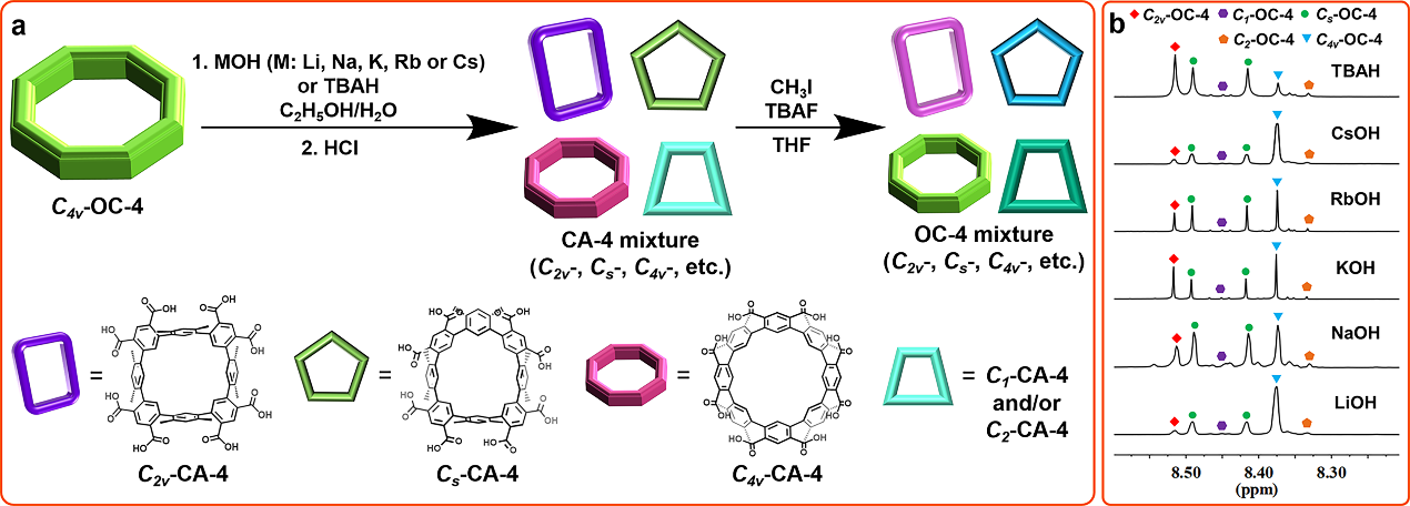 为进一步提高C4v-OC-4的逆转化率,将C4v-OC-4进行水解后再在室温下进行酯化反应,从而可获得5种对称性的OC-4阻转异构体混合物。结果表明,C4v-OC-4的转化率及不同对称性的OC-4的比例存在依赖于水解反应中所使用的碱的阳离子。当四丁基氢氧化铵作为水解步骤的碱时,C4v-OC-4的转化率及C2v-OC-4的生成率分别可达90.0%和33.6%。