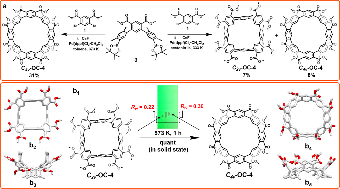 近日,龚汉元老师课题组通过片段偶联策略合成了环[4](1,3-(4,6)-二甲基苯)[4](4,6-(1,3)-间苯二甲酸甲酯) (OC-4)。在乙腈中,333 K下进行环合反应时,可获得室温下稳定的C2v和C4v对称性的两种大环阻转异构体,即C2v-OC-4和C4v-OC-4。而在甲苯中,373 K下进行环合反应时,可选择性获得C4v-OC-4。通过系列对比实验及理论计算可知C2v-OC-4和C4v-OC-4分别为动力学和热力学产物,该结论进一步通过在高温 (573 K) 下C2v-OC-4向 C4v-OC-4的定量转化得到证实。