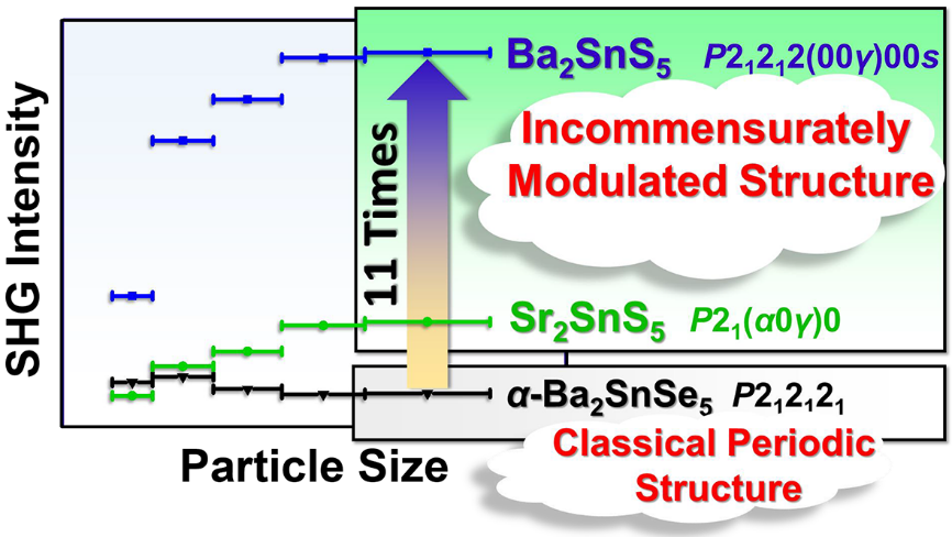 在天然矿物或人工合成的固体材料中,有极少数特殊晶体并不只简单具有普通晶体结构那种三维平移对称性, 而在其中同时存在周期性的畸变结构。这种畸变量的分布可以用“波”的形式表示, 该“波”称为调制波,具有这种特性的晶体结构称为调制结构。非公度调制结构可以引发很多有趣的物理现象,如高温超导,铁电性质,以及电荷密度波(CDWS)等。但是,将非公度调制结构与非线性光学性质联系起来的科学研究迄今还非常罕见。由于非公度调制结构不能用三维空间描述,所以解析这类结构具有一定的难度和挑战性。