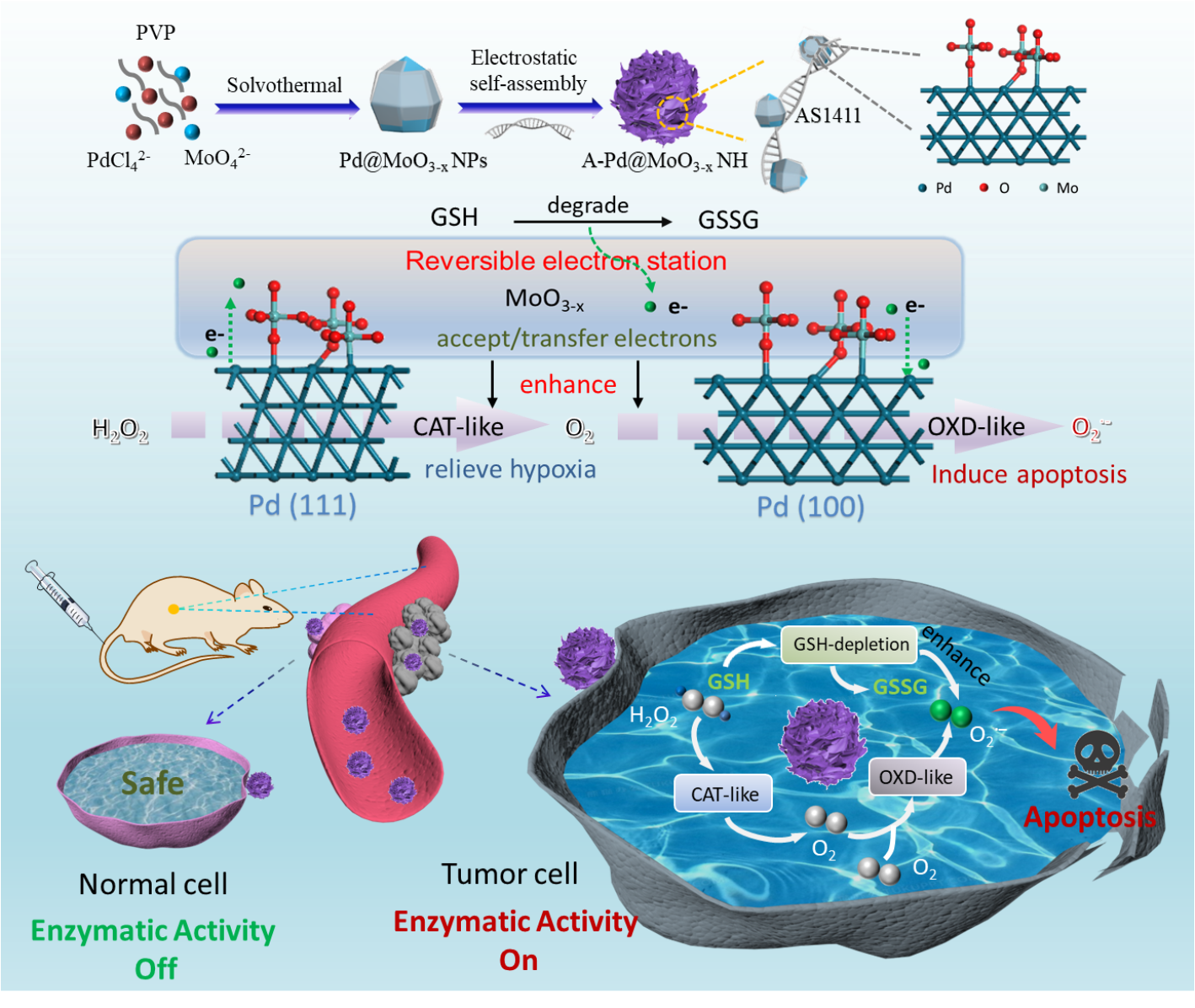 鉴于此,近日国产探花 那娜教授课题组构建了一种适配体功能化的Pd@MoO3-x纳米绣球花纳米酶(A-Pd@MoO3-x NH),用于高效肿瘤特异性治疗。利用纳米Pd的不规则形状特性,A-Pd@MoO3-x NH纳米酶同时暴露出具有过氧化氢酶活性的Pd (111)晶面和氧化酶活性的Pd (100)晶面,构成了双活性中心。这可以催化级联酶反应,在克服肿瘤厌氧的同时,进一步富集具有细胞毒性的超氧自由基(O2•−)。基于氧化还原反应,纳米酶能够有效降解消耗O2•−的GSH,避免GSH的负面影响。更重要的是,钼氧化物(MoO3-x)作为可逆电子中转站,通过氧桥和少量的Mo-Pd键,可以接收Pd (111)晶面上的电子,随后转移至Pd (100)晶面上。因此,可以协同提升双活性中心的模拟酶活性以及GSH降解能力,促进O2•−的富集。基于光谱、质谱等多种表征技术,并结合理论计算,有效证明了该双活性位点的巧妙设计,并有效实现了纳米酶的高效级联催化治疗。实验证实,在TME的弱酸性环境中,A-Pd@MoO3-x NH能够选择且高效地杀死肿瘤细胞,并得到良好的治疗效果。