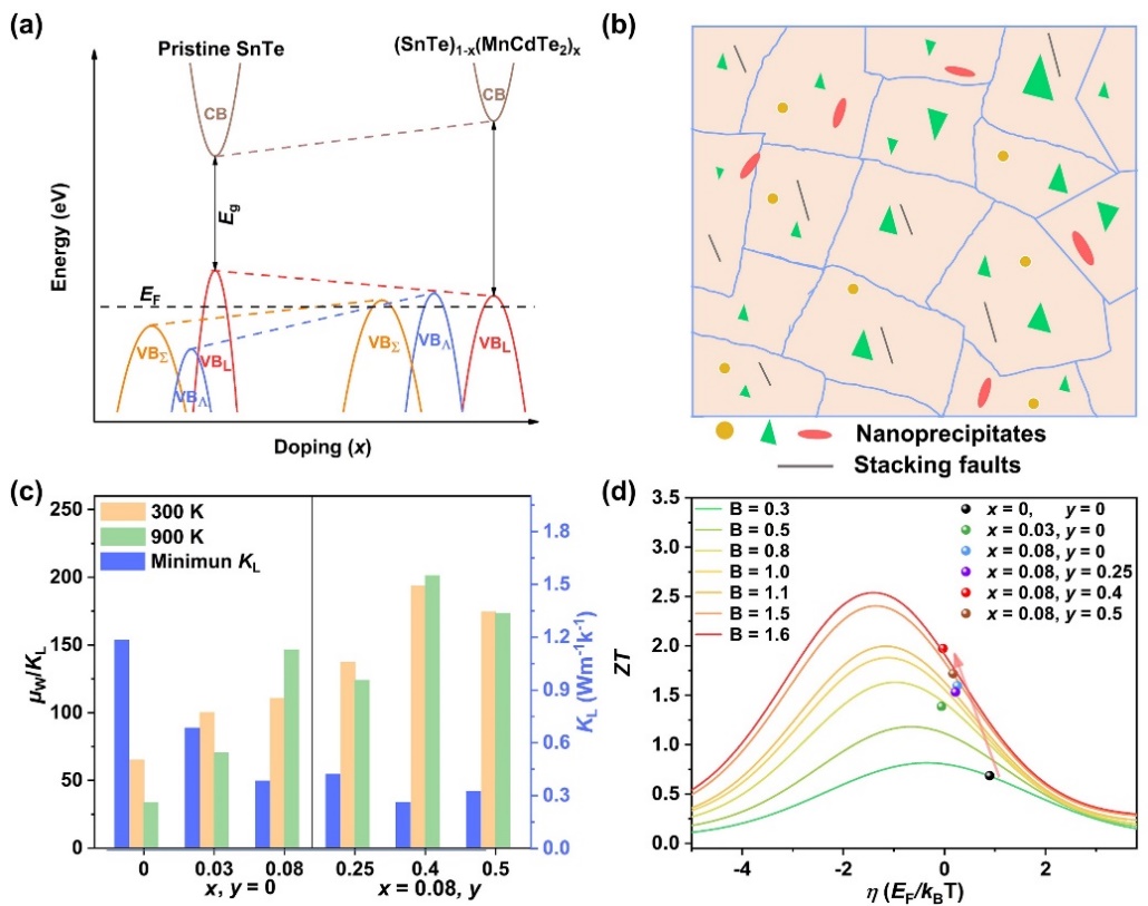 针对上述关键科学问题,国产探花 吴立明教授和陈玲教授课题组选取具有双价带电输运特征的SnTe为研究对象,通过MnCdTe2合金化策略激活了SnTe低能量位置的价带,首次实现SnTe体系三价带协同的电输运;进一步通过合理的固溶度调控,细化了析出相尺寸,最终实现热输运与电输运的协同优化。