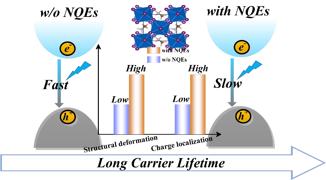 上述研究中,我们和其他课题组均采用经典力学描述原子运动,还未触及材料本身的量子属性。然而,杂化钙钛矿(如CH3NH3PbI3)中含有大量的氢,其核量子效应(NQEs)十分显著,它对载流子寿命的影响仍是未解之谜。