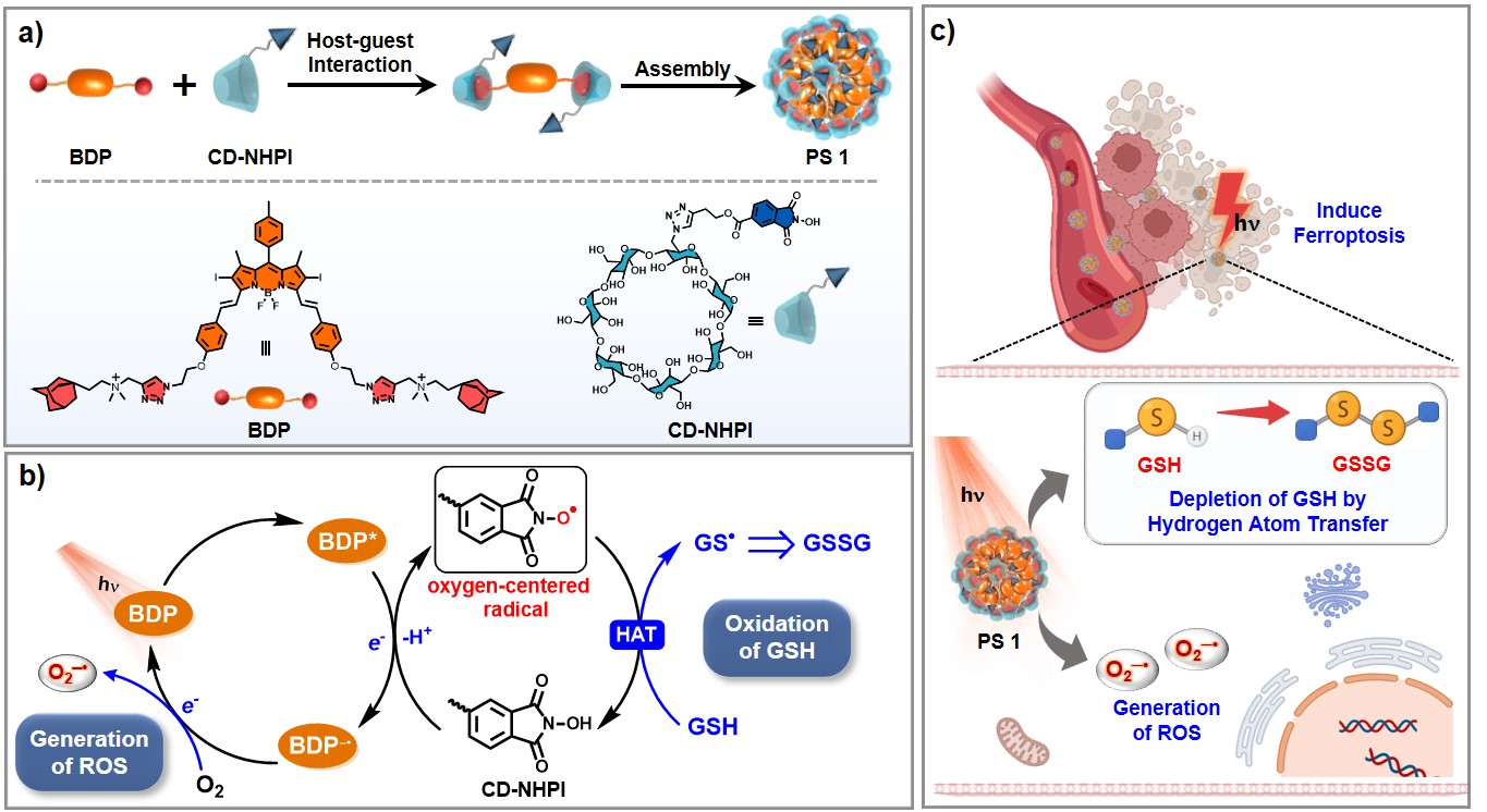 基于此理念,杨清正团队报道了一种基于氢原子转移I-型超分子光敏剂,该光敏剂可在光照下直接氧化GSH的同时生成O₂⁻•。设计将经典的 HAT 催化剂 N-羟基邻苯二甲酰亚胺(NHPI)共价连接到 β-环糊精得到CD-NHPI作为HAT催化单元和主体分子,选用 BODIPY 型光敏剂(BDP)作为光敏客体分子。通过超分子主客体作用可以拉近分子间距离,在光照下,CD-NHPI向BDP发生光诱导电子转移,形成BDP⁻•和CD-NHPI+•。其中,BDP⁻• 还原氧气生成 O₂⁻•,而CD-NHPI+• 通过脱质子生成氧自由基中间体,该中间体可从 GSH 攫取氢原子并将其氧化,最终实现了GSH的直接消耗与ROS的同时生成。