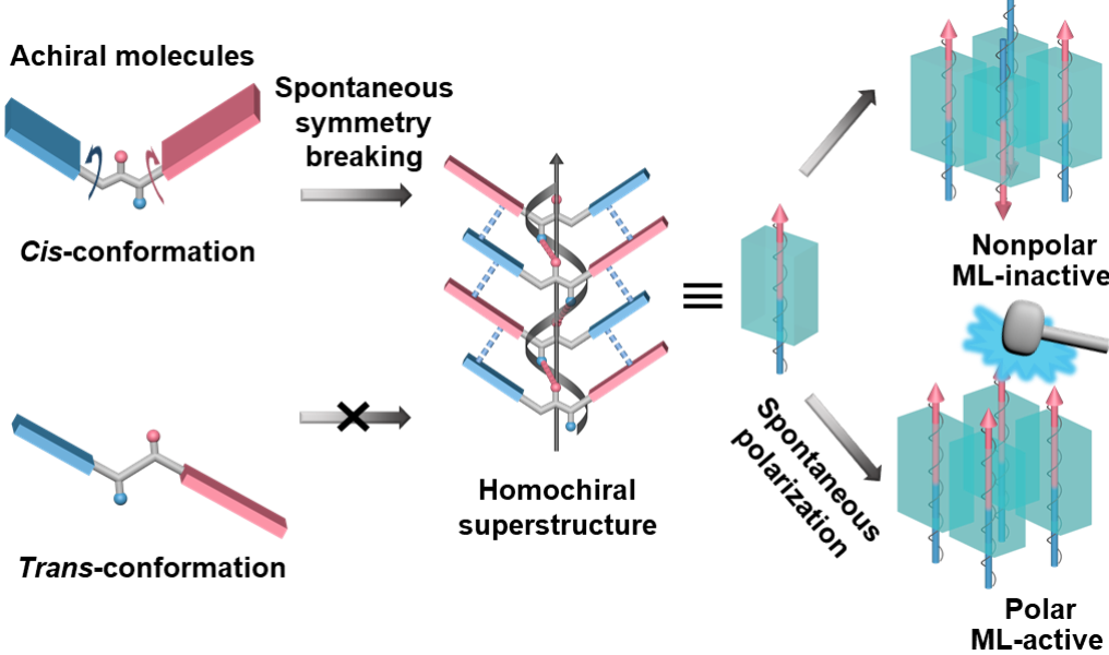 对称性破缺是一种重要的自然现象,能够产生新的功能。例如,非中心晶相的反演对称性破缺产生的压电效应、非线性光学,或者极性结构中的对称性破缺引发的热电、铁电效应等。非手性分子的自发对称破缺是构建手性、极性不对称超结构和探索涌现的光电性质的一种有潜力的途径。目前已经有一些非手性分子对称性破缺的个例被报道,但仍然缺乏有效的分子设计。