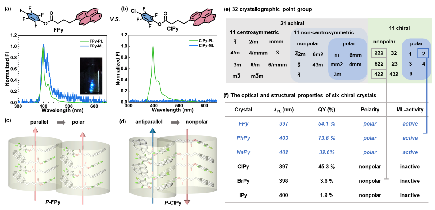 由于晶体中不存在芘基团间面对面的重叠,六种芘基手性晶体都表现出了芘单体的荧光发射。在力刺激下,FPy/PhPy/NaPy三种手性极性晶体都展现出了明亮的力致发光现象;但具有相似光物理性质和超分子螺旋结构的另外三种手性非极性晶体没有观察到力致发光现象。这一对比结果表明对称性破缺产生的极性超结构可能是产生力致发光性能的原因。