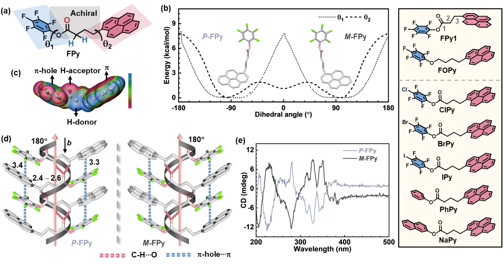 首先,作者设计合成了由五氟苯基团、芘基团和酯基柔性链组成的FPy分子。五氟苯基团与芘基团的转动能垒较小,表明FPy是构象灵活的非手性分子;同时势能曲线表明该分子具有互为镜像的潜手性构象。分子表面静电势分布表明FPy分子具有π-holeπ作用和氢键的给受体位点。单晶衍射分析表明FPy分子在结晶过程中发生了对称性破缺。同手性FPy分子采取cis-构象,通过C-HO分子间氢键和π-holeπ相互作用形成了手性极性的超分子螺旋。超分子螺旋以平行排列的方式进一步形成手性极性晶相。通过减小FPy软链碳数和还原羰基,作者利用参比化合物FPy1和FOPy,分别证明了cis-构象和分子间氢键对该体系中超分子螺旋的形成是缺一不可的。