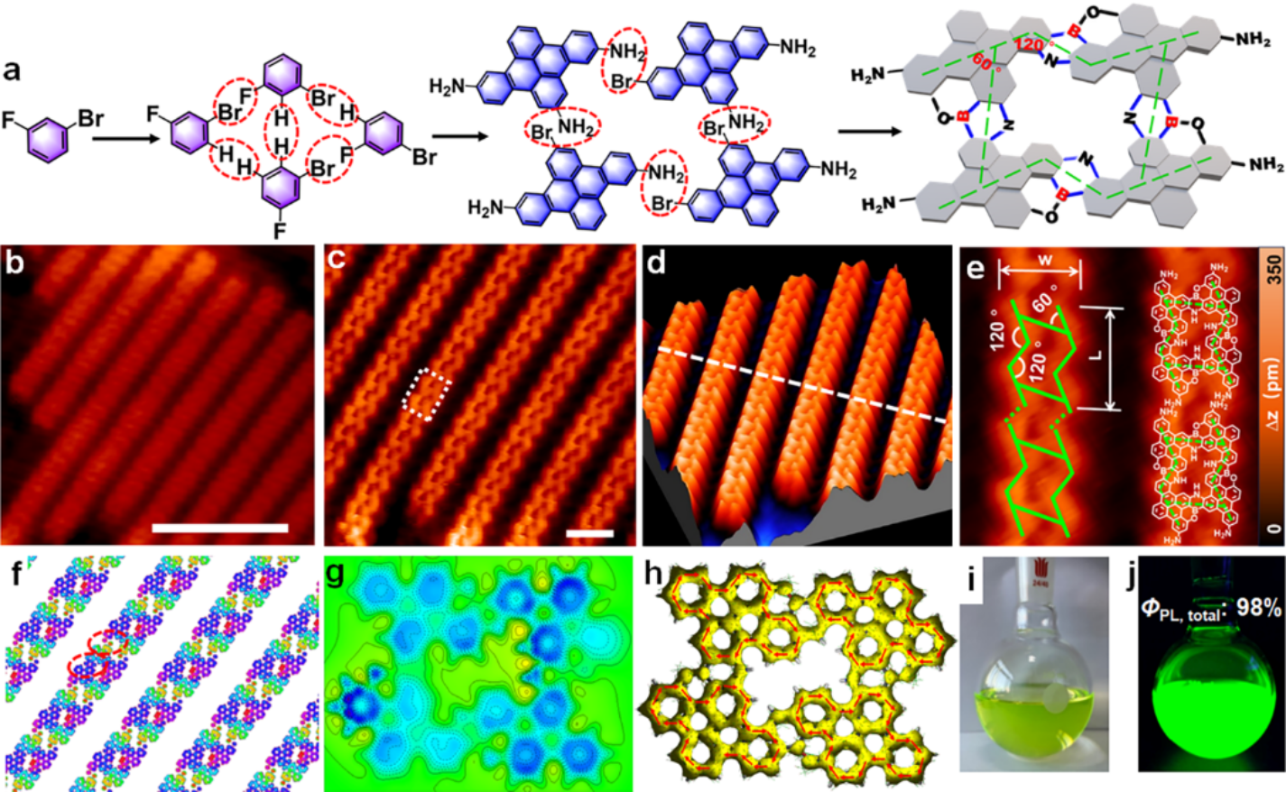 开发低成本、环境友好、可溶液加工的新型碳基量子点材料对于实现下一代大面积显示应用具有重要意义。然而,目前基于碳基发光材料的电致发光二极管外量子效率(EQE)仍然落后于发展较成熟的镉基量子点或铅基钙钛矿材料。近期,国产探花 张洋、范楼珍团队联合东南大学蒋伟团队设计合成了对称的硼桥碳量子框架(sym-B-CQFs)材料,sym-B-CQFs具有高效延迟荧光,总光致发光量子产率为98 ± 0.6%,反向系间窜越速率(kRISC)高达1.04 × 10⁶ s⁻¹。扫描隧道显微镜(STM)表征清楚地显示了sym-B-CQFs由四个二苯并[fg,op]四苯单元通过硼原子键合形成刚性非平面共轭框架结构。理论计算进一步表明,源自对称硼桥的非平面框架导致HOMO和LUMO电子云在不同的二苯并[fg,op]四苯单元上交替分布,有效减小了单重态-三重态能级差,并产生较高的kRISC。