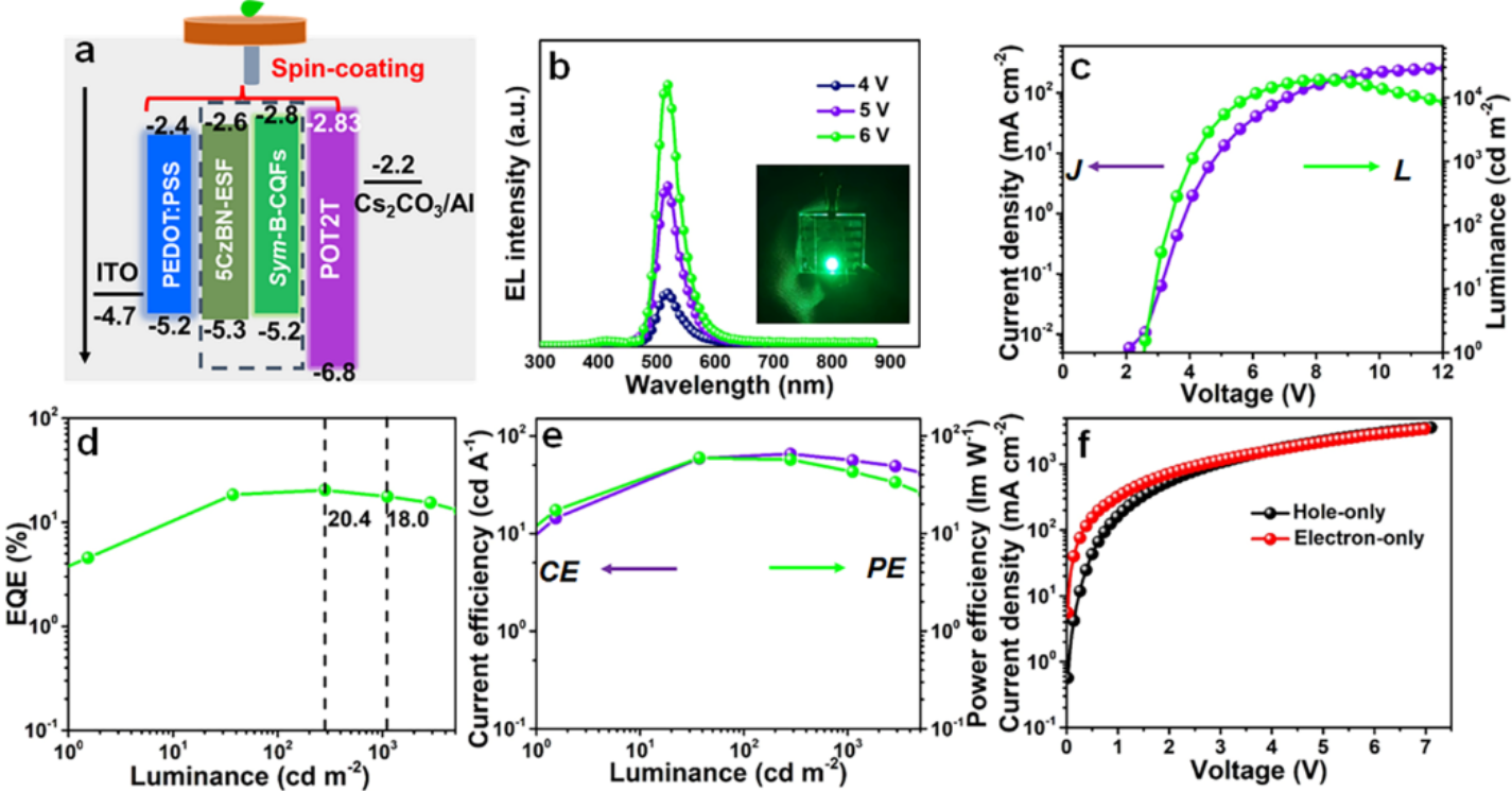 我们选择5CzBN-ESF作为主体材料,因其具有合适的三重态能级(2.72 eV)、双极性载流子传输特性以及高效的能量转移能力。基于sym-B-CQFs的电致LED首次实现了20.4%的高EQE,且器件表现出较小的效率滚降(在亮度为1000 cd m⁻²时,EQE = 18.0%)。这项工作表明CQDs有望用于下一代高性能显示技术。