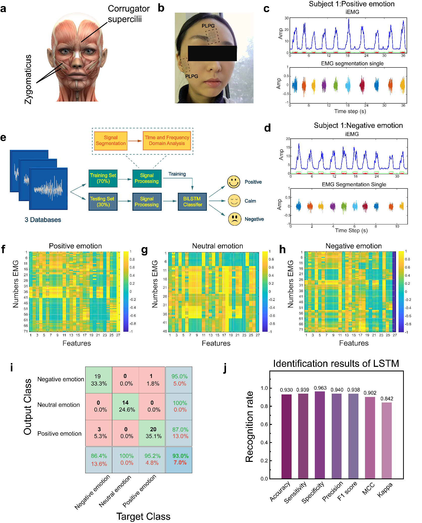 进一步,具有优化电极结构的PLPG电极被应用于微弱面部肌电信号的记录。PLPG电极可稳定地贴附于人体面部,并高质量地记录志愿者不同情绪状态下的面部肌电信号。通过与机器学习相结合,我们分析了在高兴,平静,悲伤三种情绪状态下的电生理信号,最终获得了93%的识别准确率(图3)。
