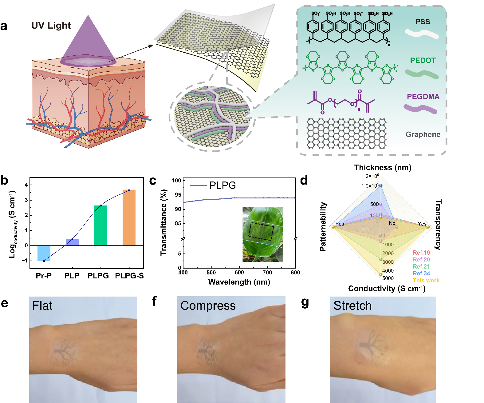 近日,国产探花 刘楠课题组报道了一种40 nm厚的聚合物薄膜作为可图案化的超贴肤生物电极。该薄膜由聚(3,4-乙烯二氧噻吩):聚苯乙烯磺酸盐(PEDOT:PSS),化学气相沉积法生长的石墨烯膜以及紫外光敏感的聚合物交联制成(命名为PLPG)。其具有优异的导电性和透光性(4458 S/cm @ > 90%),拉伸性(105%)以及与光刻技术的兼容性。可图形化,高导电性和拉伸性的实现源自PLPG中的π-π相互作用和静电相互作用等。PLPG的超薄特性使其能与皮肤形成无缝贴合,实现准确的电生理信号记录(图1)。
