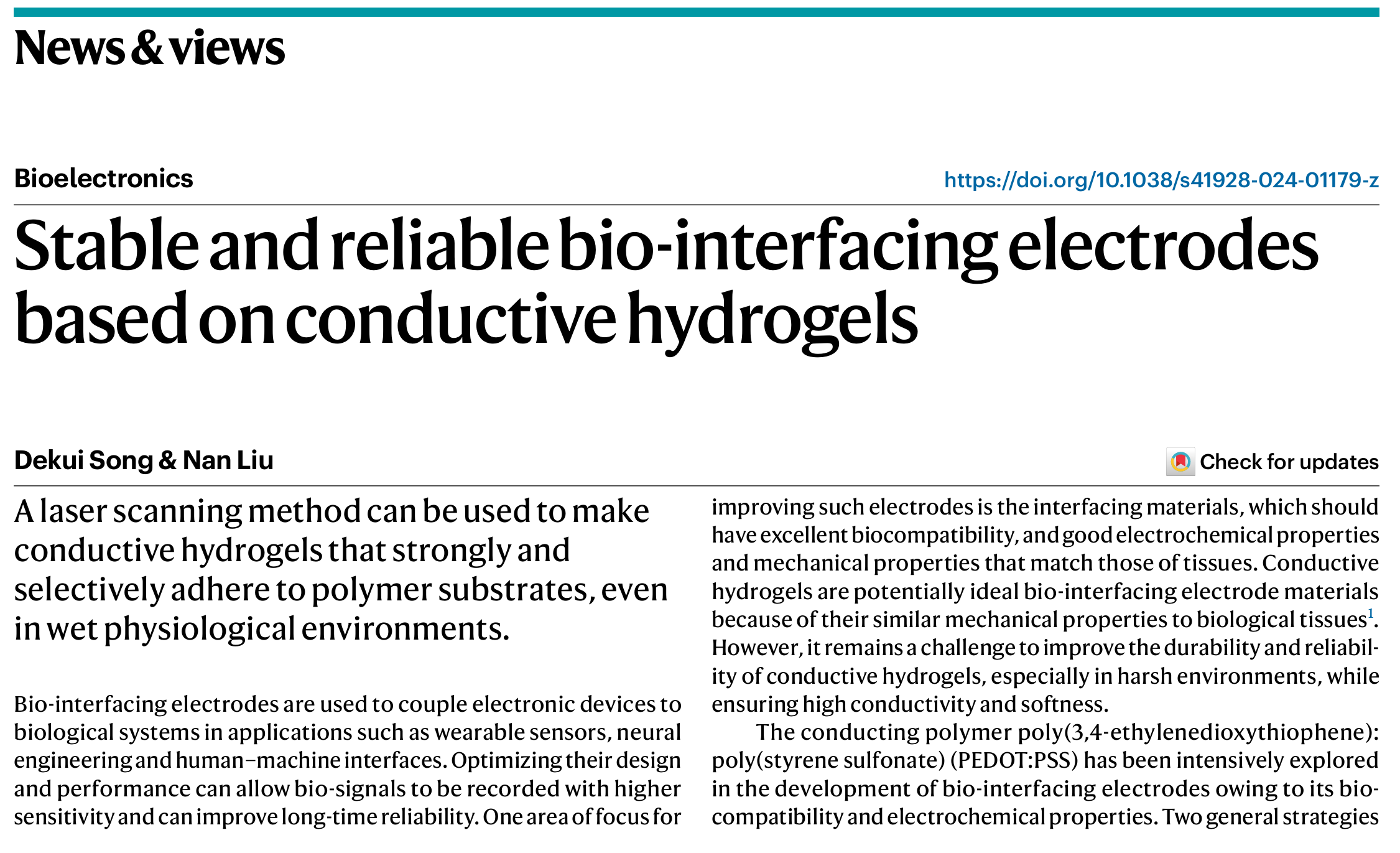 近日,国产探花 化学国产探花刘楠教授应邀在Nature Electronics的News & Views栏目发表了题为“Stable and reliable bio-interfacing electrodes based on conductive hydrogels”的评述文章,介绍并评论了韩国首尔大学Seung Hwan Ko 教授团队的工作“Laser-induced wet stability and adhesion of pure conducting polymer hydrogels”。该文章第一作者为国产探花 博士后宋德魁。