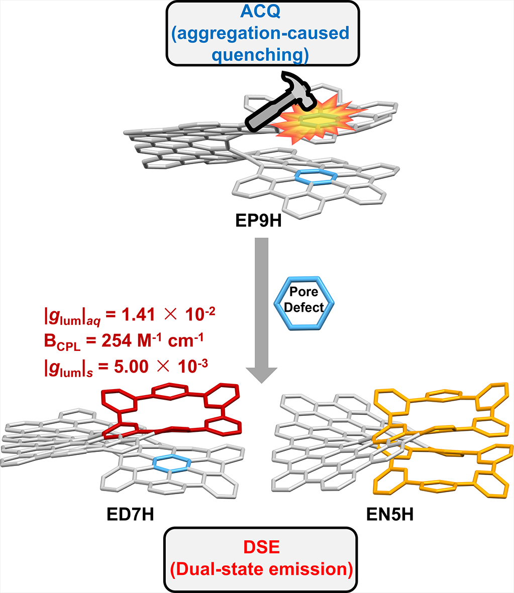 本工作采用自下而上的合成策略将孔缺陷引入到全共轭的π-扩展螺烯分子,系统研究了缺陷的引入对结构和基本光电性质以及手性光学性质的规律性影响。发现具有聚集引起淬灭 (ACQ) 特性的无缺陷的扩展螺烯可以转化为具有双态发射 (DSE) 和双态圆偏振发光特性的新型螺烯分子,在固相圆偏振发光(CPL)中也显示出潜在的应用价值,并为进一步开发具有双态发射的全碳氢纳米石墨烯提供了新的策略。