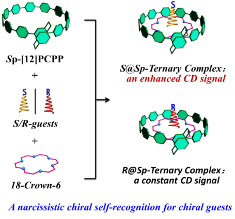 近日,国产探花 江华教授课题组报道了基于[2.2]对环芳烷([2.2]PCP)的手性碳纳米环,并将其应用于手性三元络合物的分级自组装及其自恋性手性识别中。众所周知,取代的[2.2]PCP由于其不同的取向而表现出较好的结构多样性和稳定的手性。基于此,作者将[2.2]PCP作为手性基元引入到CPP中,合成了手性碳纳米环(Sp/Rp-[12]PCPPs)。同时,作者发现Sp/Rp-[12]PCPPs不仅可以包结18-Crown-6形成环中环型二元络合物,也可以包结18-Crwon-6和质子化手性胺络合物形成手性三元络合物:即同手性S@Sp-/R@Rp-和异手性R@Sp-/S@Rp-三元络合物。这些三元手性络合物表现出不同的CD响应信号,为自恋性手性自识别奠定基础。