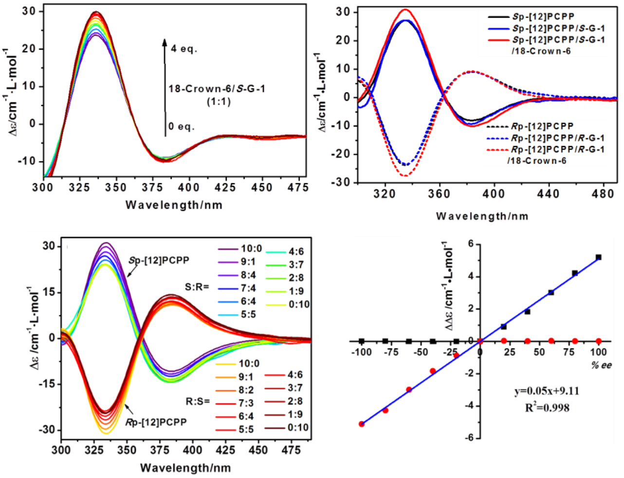 之后,作者发现随着18-Crown-6/S-guests络合物在Sp-[12]PCPP中的增加,引起了其在340nm处CD信号的增强。而18-Crown-6/R-guests的加入并不能引起Sp-[12]PCPP的CD信号的变化,这说明了同手性R@Rp-/S@Sp-三元络合物分别对S/R-质子化胺具有较好的自恋性手性识别能力,可用于质子化手性胺的对映选择性识别。同时,对照实验显示18-Crown-6在手性三元络合物的构建中扮演着不可或缺的角色。最后,手性三元络合物被进一步用于确定手性客体分子的ee值。这一发现突出了手性碳纳米环在构建新型手性三元络合物方面新的用途,拓展了碳纳米环结构在超分子化学和材料科学中的应用。