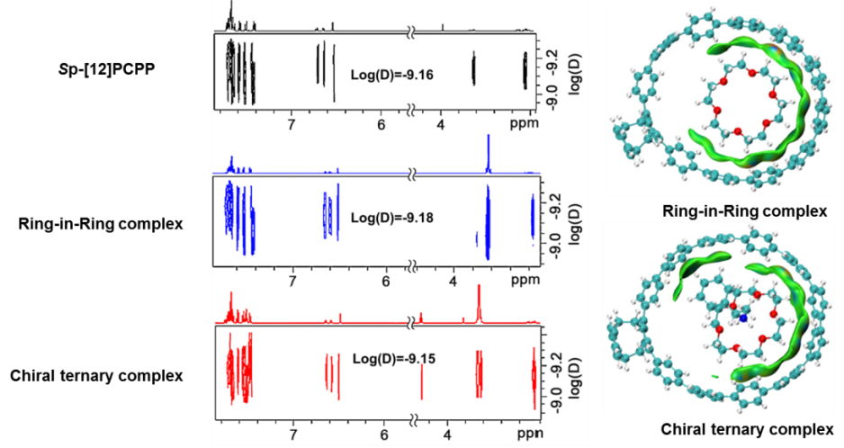 首先,通过研究Sp-[12]PCPP络合18-Crown-6 (或18-Crown-6和质子化手性胺的络合物)的相关1H NMR(实验和理论计算)、1H DOSY和NOESY等实验,证明了环中环和手性三元络合物的形成。同时,IGM分析证明了在环中环和手性三元络合物中色散力和多重C−H•••π相互作用的存在,进一步证明了环中环和手性三元络合物的形成。