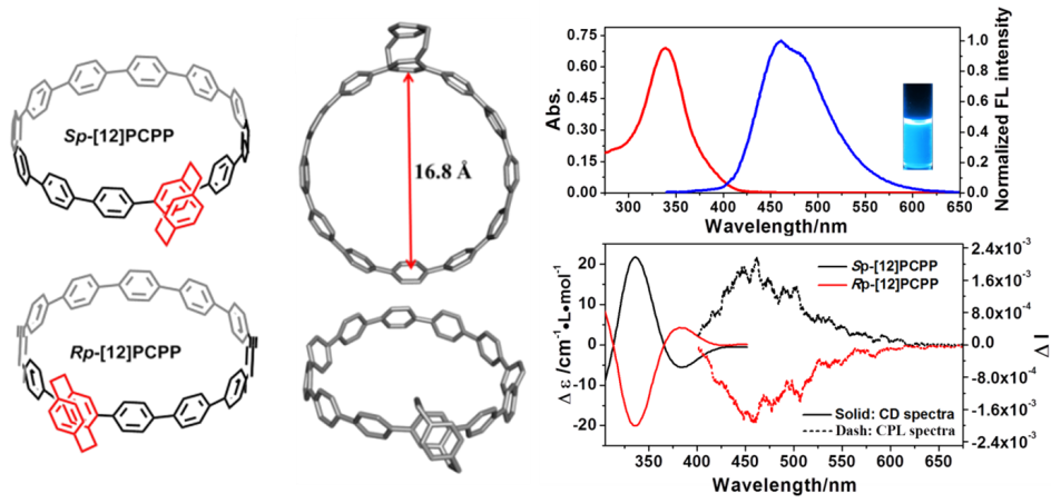 主客化学和超分子化学的兴起和蓬勃发展为构建各种超分子结构提供了机会。其中,大环与客体分子的分级自组装可以从根本上改变其动力学和化学行为。近年来,一系列诸如环中环、笼中笼、洋葱型、球中球及俄罗斯套娃型等二元/三元络合物也被相继报道。以环对苯撑(CPP)为代表的碳纳米环由于其弯曲π共轭空腔,使它成为构建多元超分子体系的优秀主体之一。当碳纳米环被一个更大的主体包结时,它可以发生角色转变而成为客体分子,这为二元络合物的构建提供了一个机会。近年来,理论和实验的研究也证明了较大的碳纳米环可以嵌套较小的环形成二元络合物。但是,基于碳纳米环的手性三元络合物的构建仍具有较大的挑战性,迄今尚未有报道。