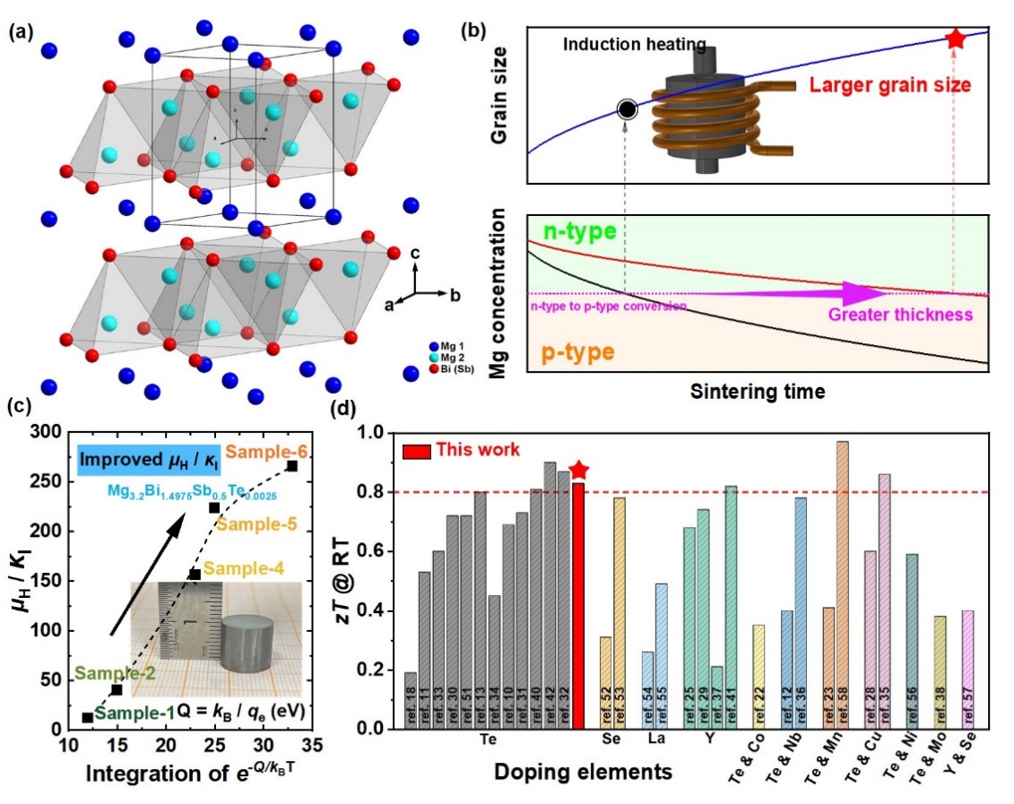 热电制冷是一种基于帕尔帖效应的全固态环保制冷技术,具有精准温控、尺寸灵活和零排放等优势。Mg3(Bi,Sb)2材料机械性能、热电性能优良;材料组分毒性小,成本低廉,是下一代热电制冷材料的备选材料之一(Science 2019, 365, 495; Joule 2022, 6, 193.)。然而,该材料在实际应用中面临两大挑战:其一,合成过程中镁元素蒸气压较高,使得所得材料的热电性能出现费米能级“钉扎”效应,对合成工艺极为敏感而表现出不稳定性;其二,在室温条件下,晶界对电子的强散射作用,显著限制了材料的电输运性能。如何解决这两大难题,具有重要的科学意义和实用价值。