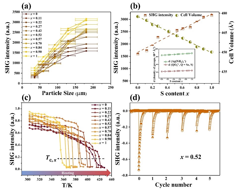 非线性光学(NLO)开关材料可在外场(如:光、热、压力等)刺激下,NLO性质发生“开-关”两种状态的切换,在光开关和光计算等领域具有重要应用,是非线性光学材料研究的一个重要分支。热致非线性光开关固态材料在“开-关”两个状态间的切换主要依赖材料本身的相变温度(Tc),然而,目前大多数固态非线性光学开关材料具有固定的相变温度,这严重限制了其应用温度范围。如何实现对Tc的精确调控具有很大的挑战。