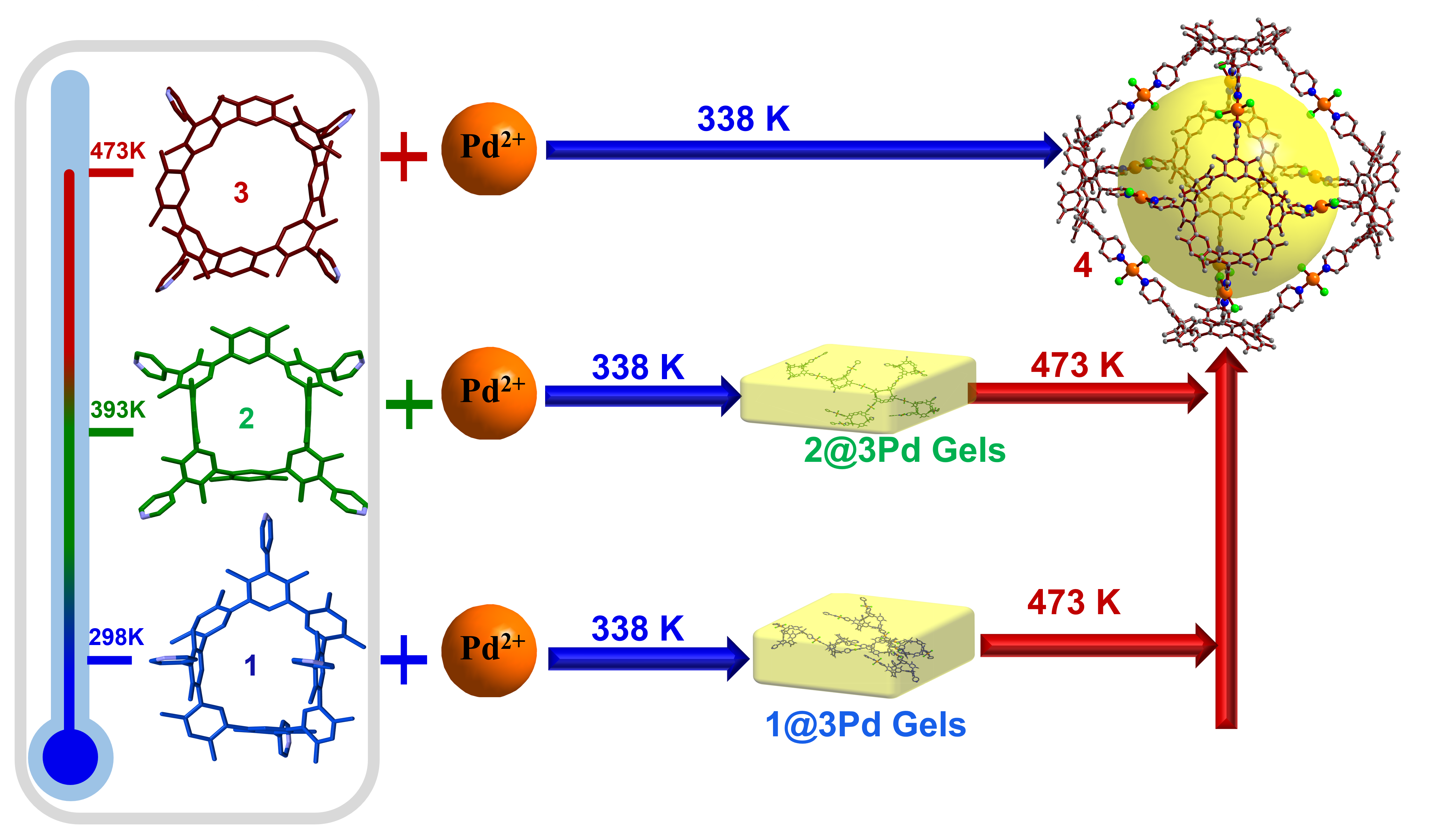 更有趣的是,对温度的控制不但可以用于特异性地实现阻转异构体的转化,还可以进一步控制分步或原位自组装。这两种方法都产生了类似八面体的金属有机笼4。3与Pd2+配位在338 K下可直接形成金属有机笼4。当1或2与Pd2+结合时,原位形成黄色凝胶。当对凝胶进行加热时,大环刚性骨架会翻转,并最终诱导金属有机聚合物凝胶转变为分子笼结构,实现了通过热诱导大环分子构象转变,进一步直接调控自组装体系。据我们所知,这是纳米尺度上热响应调节大环分子并进一步调控自组装的第一个例子。这种方法为热响应材料的制备提供了一种新的策略。