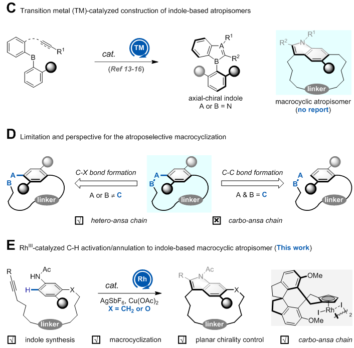 过渡金属催化的不对称吲哚合成法(如Cacchi反应、烯胺氮芳基化反应、Larock吲哚合成、Rh催化的C–H活化/环合反应等)受到了广泛关注。然而,不对称吲哚合成法大都集中于构建轴手性吲哚,尚未有利用这类方法构建大环阻转异构体的报道。不对称大环化反应在构建平面手性大环分子方面受到了关注,该类反应同时构建大环并控制平面手性,大大提高了合成效率。近年来,合成化学家先后发展了手性磷酸催化的羟基对联烯加成、酶催化的大环内酯化、氮杂环卡宾催化的大环内酯化、相转移催化的芳香亲核取代和钯催化的碳氧键偶联等不对称大环反应,这些开创性的方法为催化不对称构建平面手性环蕃烷提供了新思路。目前,这类策略以形成C–O键和C–N键为主,导致无法合成全碳链的平面手性大环结构。