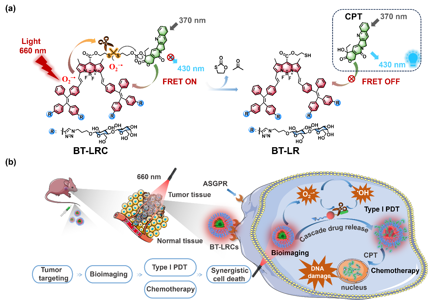 针对上述问题,国产探花 邢国文教授课题组报道了一种乳糖修饰的光笼分子BT-LRC,通过超氧阴离子自由基(O2−•)可切割的缩硫酮键将喜树碱(CPT)共价连接到氟硼荧-四苯乙烯(BODIPY-TPE)杂合荧光团上,光照下实现了I型光动力治疗(PDT)和抗癌药物光控释放。两亲性的BT-LRC在水溶液中自组装成具有聚集诱导发光(AIE)性质的活性纳米粒子(BT-LRCs)。乳糖基团与肝癌细胞(HepG2)表面去唾液酸糖蛋白受体(ASGPR)的特异性结合显著增强了BT-LRCs的肿瘤靶向能力。BT-LRCs可以在红光光照下产生大量的O2−•,有效切割缩硫酮键,迅即释放出DNA损伤剂CPT。体内实验研究表明,该自组装光控纳米前药系统在肝癌荷瘤小鼠模型中表现出很好的光疗和化疗协同抗肿瘤效果。该工作为抗乏氧型的糖基化光笼分子在可视化光控释药和精准靶向治疗中的应用提供了新的研究思路。