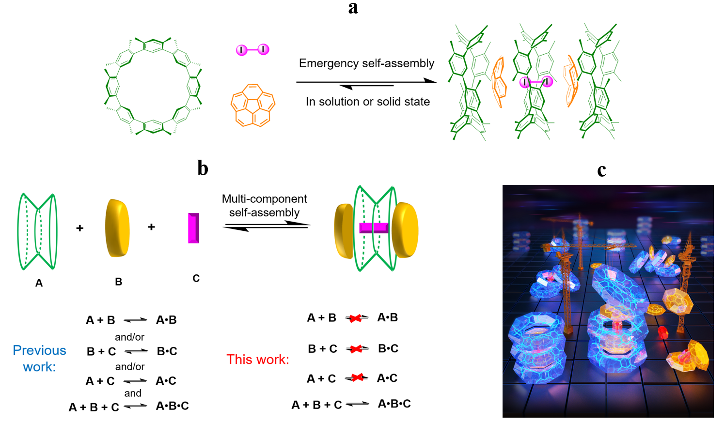 图1. a, D4d-CDMB-8、心环烯和I2的三组分涌现自组装;b,已报导的和该研究的三组分自组装体系的差异;c, D4d-CDMB-8、心环烯和I2的三组分涌现自组装卡通示意图。