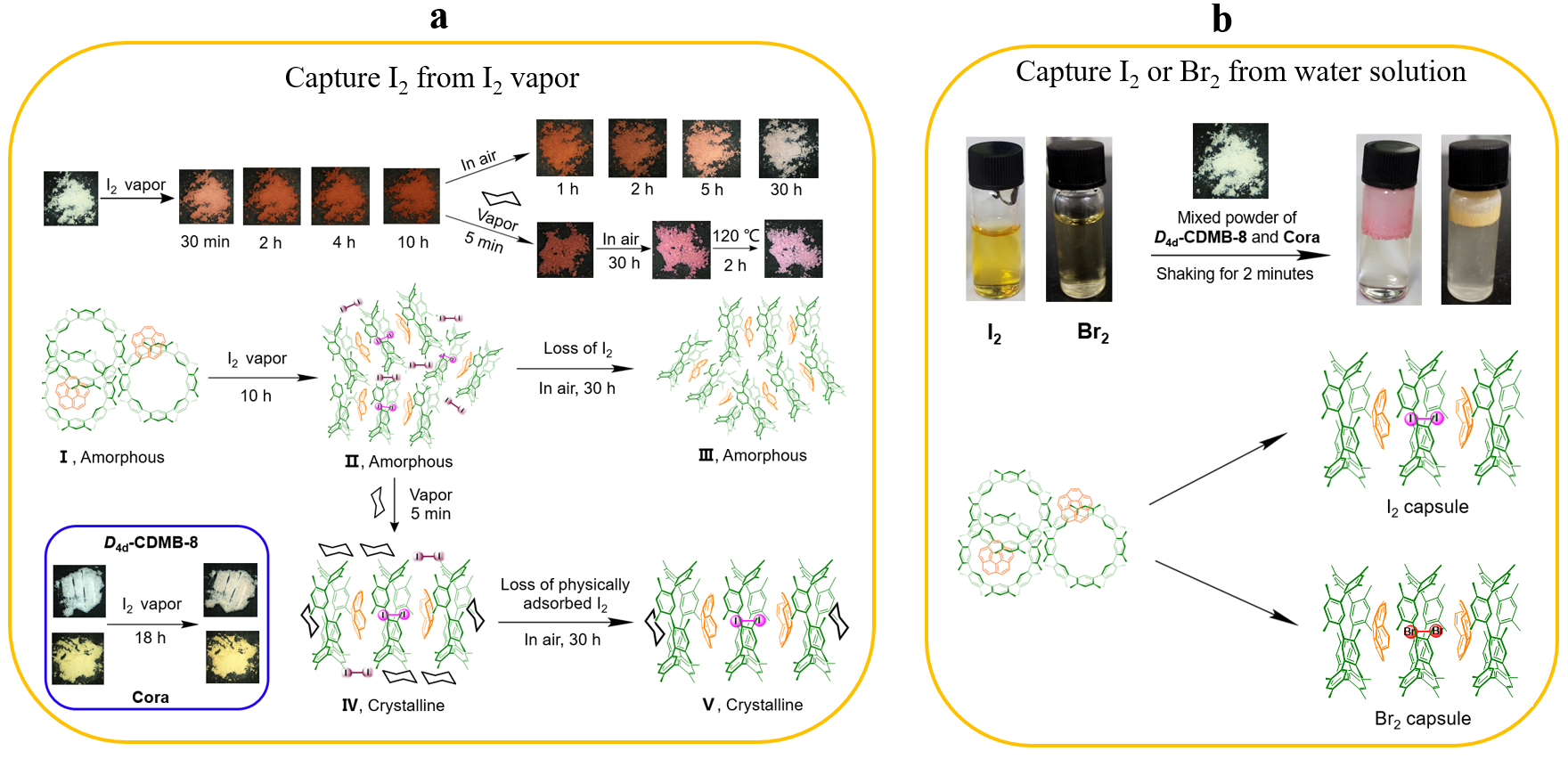 图2. a, D4d-CDMB-8、心环烯及其混合粉末对I2饱和蒸汽中的I2的捕获及稳定,和对应的结构变化示意图;b, D4d-CDMB-8和心环烯混合粉末在水溶液中提取和I2或Br2及对应的结构示意图。