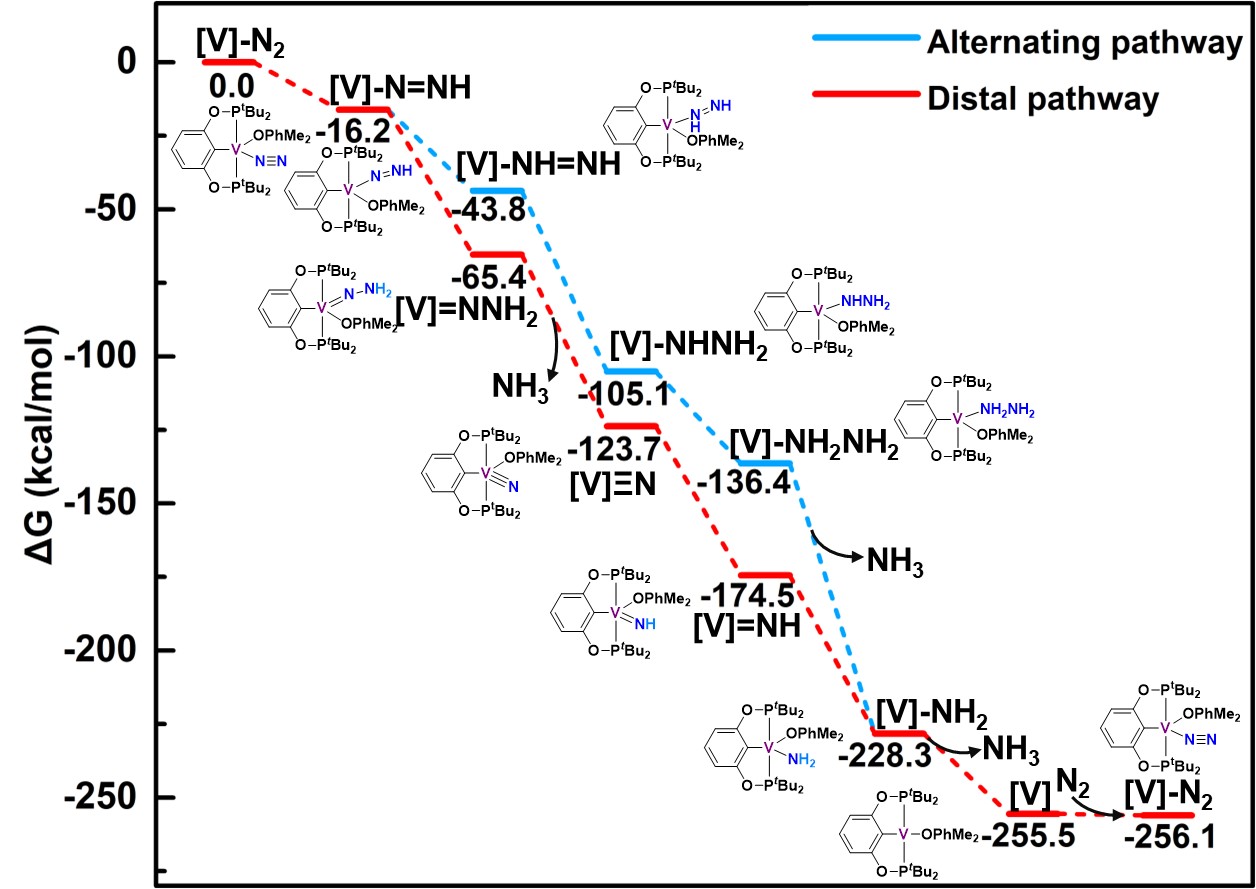 为了更好地理解反应机理并开发出温和条件下的合成氨催化剂,人们在过渡金属配合物活化N2方面做了很多工作,也发展出几例氮气还原转化为氨的催化体系,而对于与固氮酶密切相关的钒金属配合物催化体系的研究却很少,且对催化过程中V(NxHy)中间体的研究几乎是空白。因而研究钒的模型配合物催化氮气活化和其中的质子/电子传递具有重要的意义。