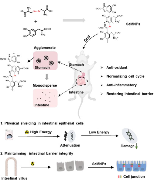 对此,国产探花 曹玮教授提出了将硒代半胱氨酸修饰的黑色素纳米颗粒(SeMNPs)用于肠道放射防护的策略。引入硒增加了黑色素对辐射能量的衰减,并表现出卓越的抗氧化性能,同时在胃肠道环境中保持稳定的活性,并能够精确调节释放动力学,使其成为肠道损伤口服治疗的理想选择。口服后,SeMNPs有效减轻辐照引起的肠道损伤,并将小鼠全身照射后的存活率从20%提高到100%。这项研究为用于体内放射防护、口服药物和基于生物大分子的新兴材料开发提供了有价值的参考。