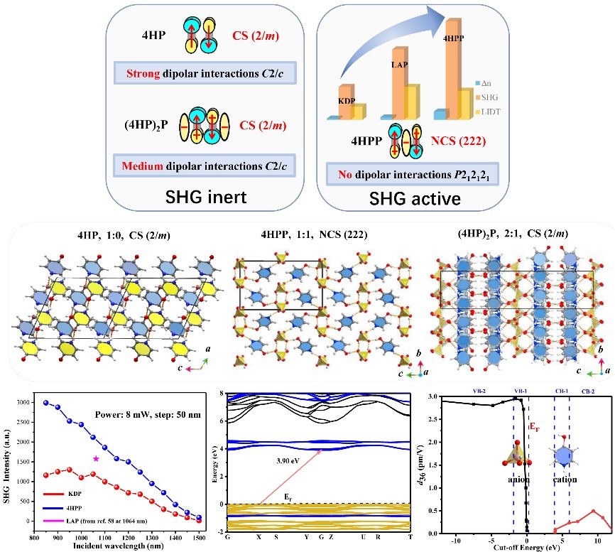非线性光学(NLO)材料在激光倍频、电光调制、光存储、光限幅和光开关等方面具有广泛应用,是实现以光电子技术为核心的现代信息技术的重要物质基础。其中紫外日盲区(solar-blind, 210-280 nm)非线性光学材料,在安全通信网络、火灾监测系统和食品杀菌等应用的重要应用。目前大多数商用的紫外非线性光学材料为无机材料,而有机材料很少,这主要是因为:1) 有机非线性基元间容易存在较大的偶极相互作用,这促使75%的有机材料结晶于中心对称结构,进而使晶体无二阶NLO响应;2)有机基团间的团聚,容易使得大多数构建的有机NLO晶体能隙发生红移,造成晶体在紫外范围内不透明。因此,如何在含大偶极矩有机系统中打破中心对称陷阱,设计合成综合性能优越的紫外有机NLO材料具有重要的意义。