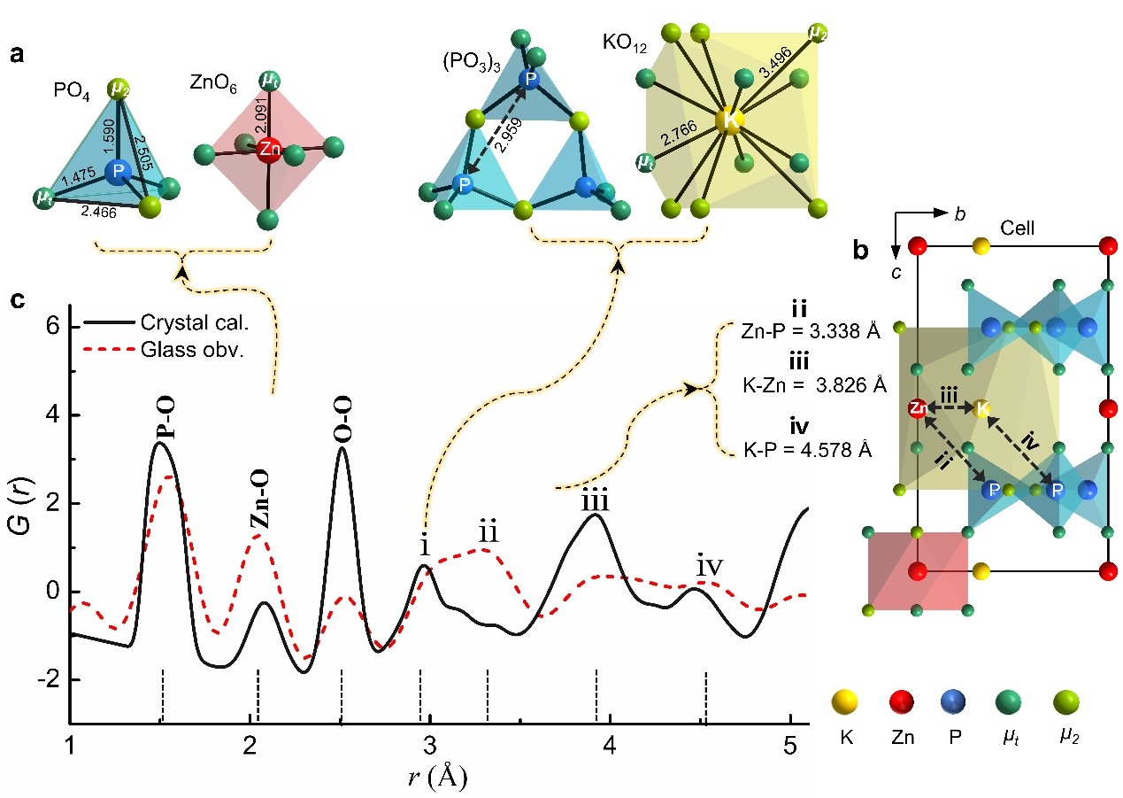 吴立明教授和陈玲教授与燕山大学王利民教授合作,通过熔融淬火的方法,利用六方KZnP3O9以及正交RbZnP3O9晶体,分别制备了新颖的AZnP3O9玻璃(A = K, Rb)。这两例罕见的晶体-玻璃对,由于化学组成相同,因此,AZnP3O9玻璃的短程序结构研究得以深入。拉曼、核磁以及对关联函数(PDF)研究证实了AZnP3O9晶体-玻璃之间存在不同程度的短程序(5Å范围内)相似性。他们定义了新参数:d = nglass/ncry(n为PDF峰数目)。利用该参数,定量鉴别了玻璃从晶体结构上获得的短程序结构继承度。他们还发现该d参数具有一定的普适性,能定量描述其他24种见诸报道的玻璃体系,如硅酸盐玻璃、硼酸盐玻璃、金属玻璃、有机玻璃以及有机无机杂化玻璃等。其中KZnP3O9玻璃的d值和PDF峰数目均最大,表明该玻璃完全继承了晶体结构的5Å范围内的短程序。进一步地,他们还发现KZnP3O9玻璃相较RbZnP3O9玻璃,d值减小,一些关键的热力学参数,如:归一化玻璃态假想温度