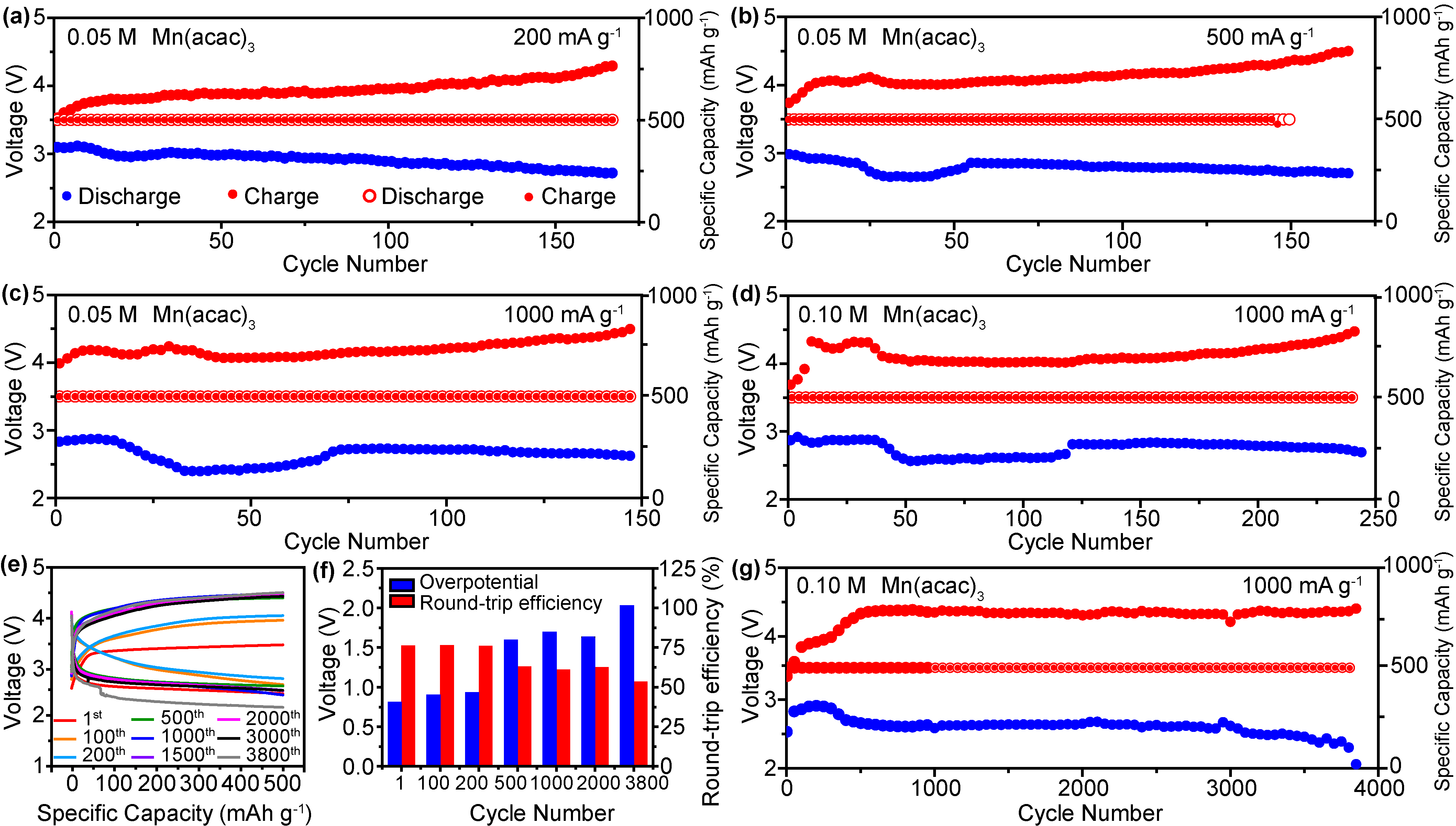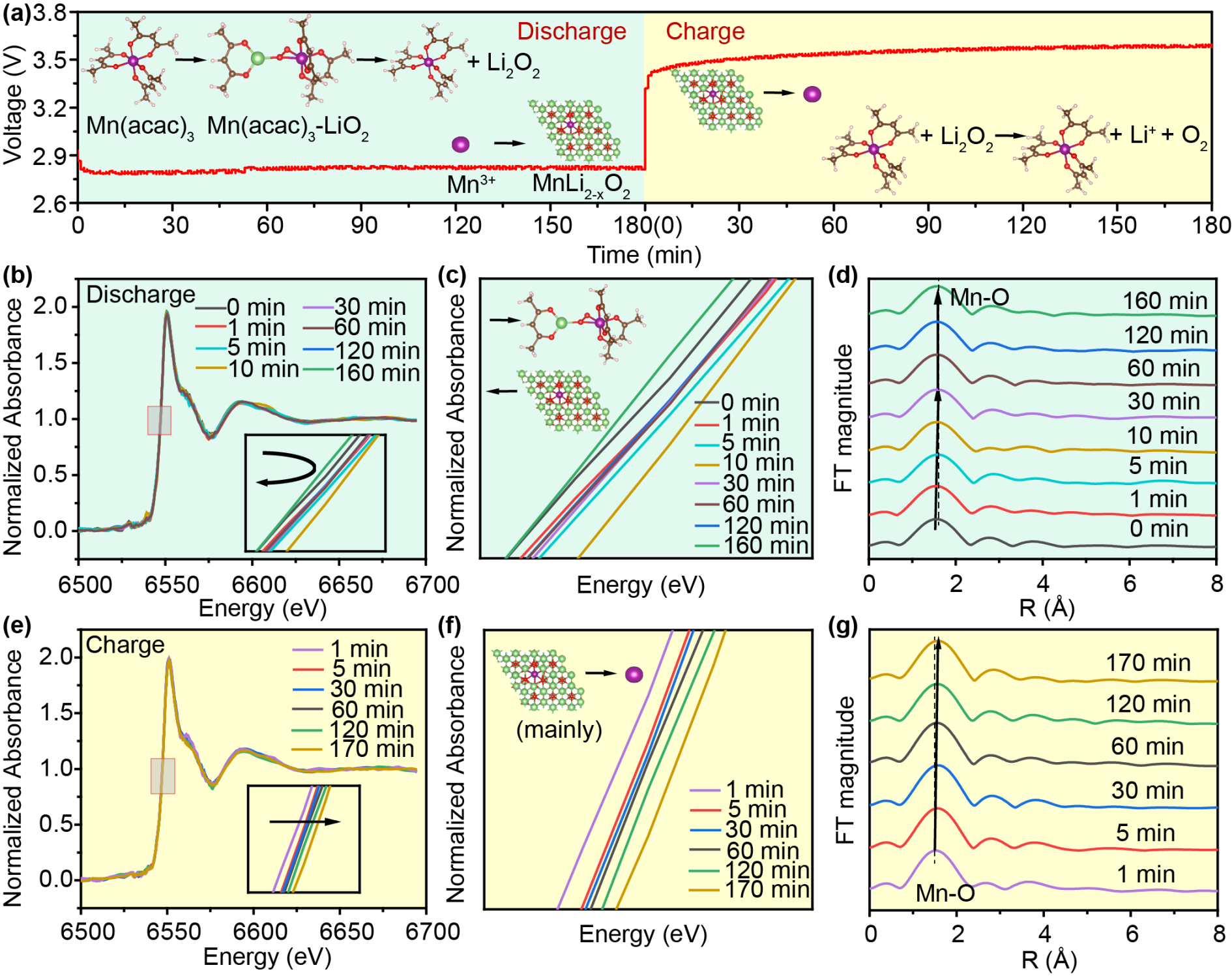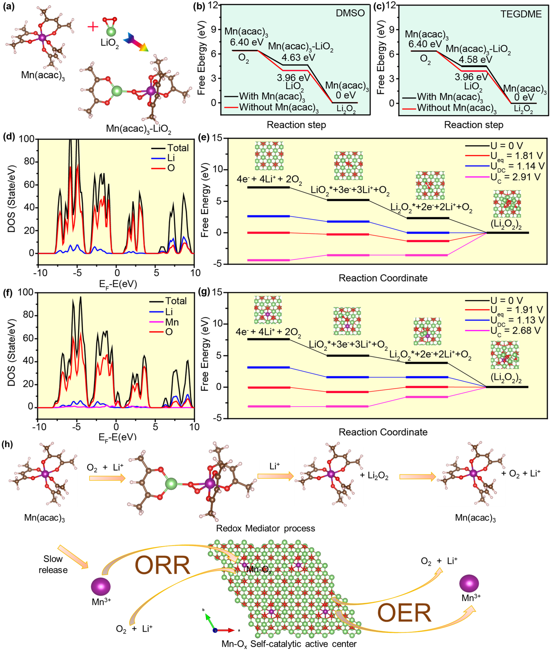 基于此,国产探花 孙根班教授团队提出了一种自催化与氧化还原媒介协同耦合的超长循环寿命的锂空气电池体系。采用具有弱电解质性质的有机金属盐作为双功能添加剂,耦合自催化体系与中间产物反应路径的优化,使乙酰丙酮盐在Li-O2电池中表现出作为过渡金属阳离子和氧化还原介质的双重特性。如图1所示,在Mn3+和Mn(acac)3分子共存的情况下,金属离子可以通过原位电化学植入法,经过还原后,掺杂进入Li2O2,形成放电产物Mn-Li2-xO2,从而改变其绝缘性能。此外,有机金属盐作为液相氧化还原介质(RMs),有效捕获和稳定中间相LiO2,形成复杂结构Mn(acac)3-LiO2,在充电过程中不仅能够稳定中间体LiO2,还能促进中间体进一步转化生成Li2O2,并增强分解反应,这一点通过原位同步辐射和紫外可见光谱得到进一步证实。含有Mn(acac)3的Li-O2电池显示出0.43 V的超低过电位,并在1000 mA g-1下能够维持250次长循环。如图2所示,当结合反应环境优化策略,可在1000 mA g-1下实现3850次的长循环稳定性。通过理论计算模拟,提出了利用Mn(acac)3的Li-O2电池的ORR和OER机制。如图3所示,揭示了氧化还原介质的作用以及基于分子形式Mn(acac)3和电化学植入的活性Mn-Ox簇的自催化反应机制,进一步证实了自催化体系与氧化还原媒介协同耦合的机理,为设计先进的超长寿命锂氧气电池系统和提高其电池关键性能提供了新的见解。
