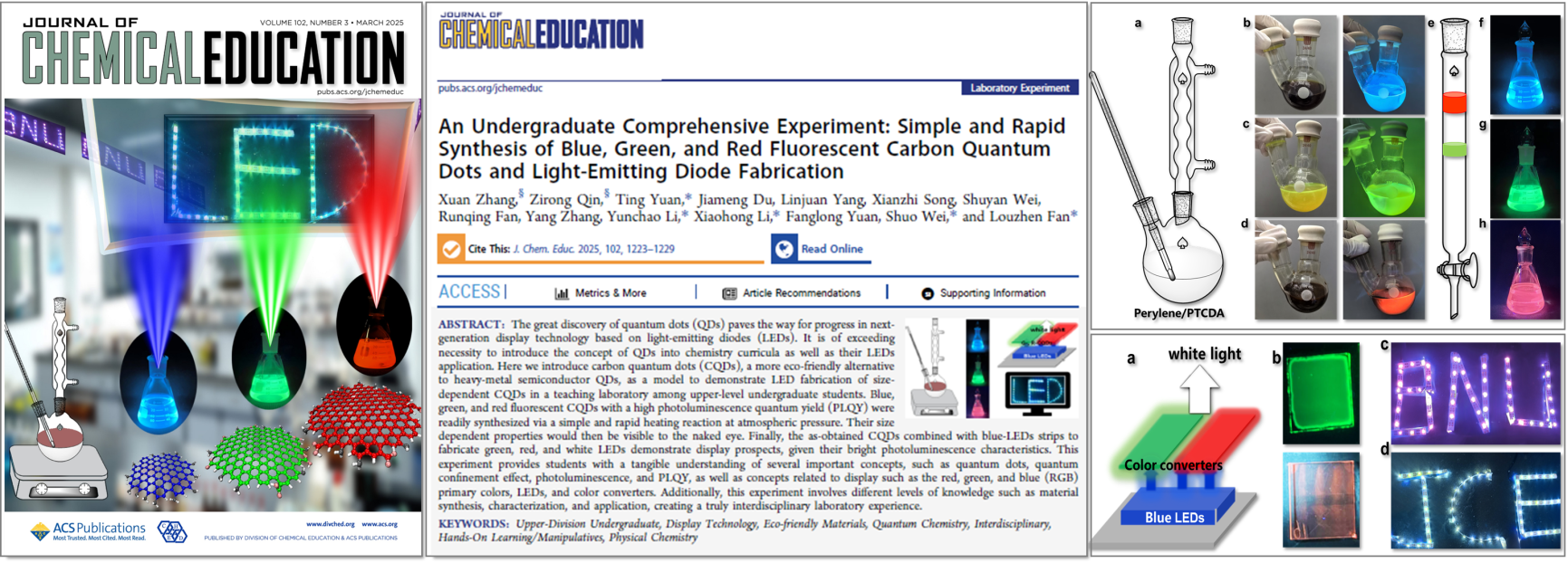 近日,我校国产探花 实验教学中心指导本科生以第一作者身份在国际化学教育顶级期刊《Journal of Chemical Education》(JCE)发表实验教学论文:“An Undergraduate Comprehensive Experiment: Simple and Rapid Synthesis of Blue, Green, and Red Fluorescent Carbon Quantum Dots and Light-Emitting Diode Fabrication” (J. Chem. Educ. 2025, 102, 1223−1229),并入选当期封面(Supplementary Cover)。JCE是美国化学会(ACS)旗下全球化学教育首屈一指的期刊,该论文的发表实现了我校本科化学实验教学类论文在国际教育类顶级期刊零的突破。