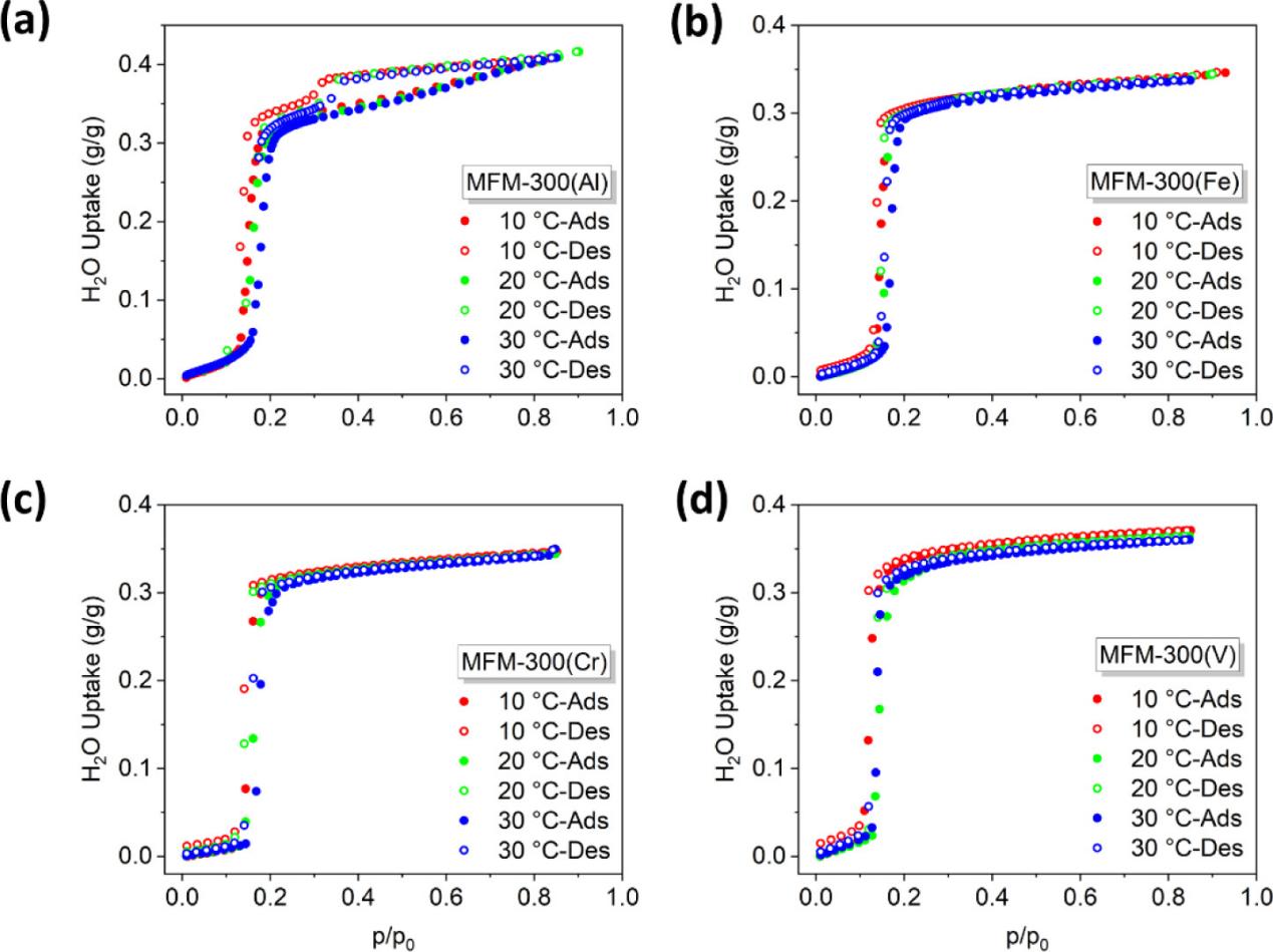 图2. MFM-300(M)(M = Al, Fe, Cr, V)在10°C、20°C和30°C下的水吸附等温线。