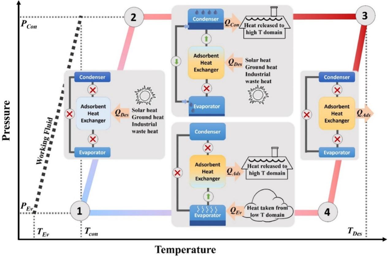 目前空调制冷用电占全球总用电量的10%以上,且随着全球变暖,此占比正快速攀升。传统空调设备主要依赖电力驱动的压缩机来实现制冷剂循环,这一过程不仅会消耗大量的电力资源,而且所使用的含氟制冷剂还对环境存在潜在危害。相比之下,吸附式制冷(Adsorption Driven Cooling)技术利用低品位热能替代电能驱动制冷循环,并且以水作为绿色制冷剂,这种技术因其在节能减排方面的显著优势,被看作是实现碳中和目标的关键途径之一。然而,目前所使用的吸附剂,例如硅胶和沸石等,却存在着诸多亟待解决的问题,如工作容量偏低、再生温度过高等,这些问题严重制约了吸附式制冷技术在实际应用中的推广与普及。