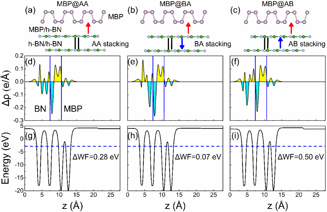 图1. 根据BN不同的极化构型构建的异质结。(a)无极化MBP@AA,(b)极化向下MBP@BA,(c)极化向上MBP@AB。(d)-(f)和(g)-(i)分别是三个结构的差分电荷和功函数。