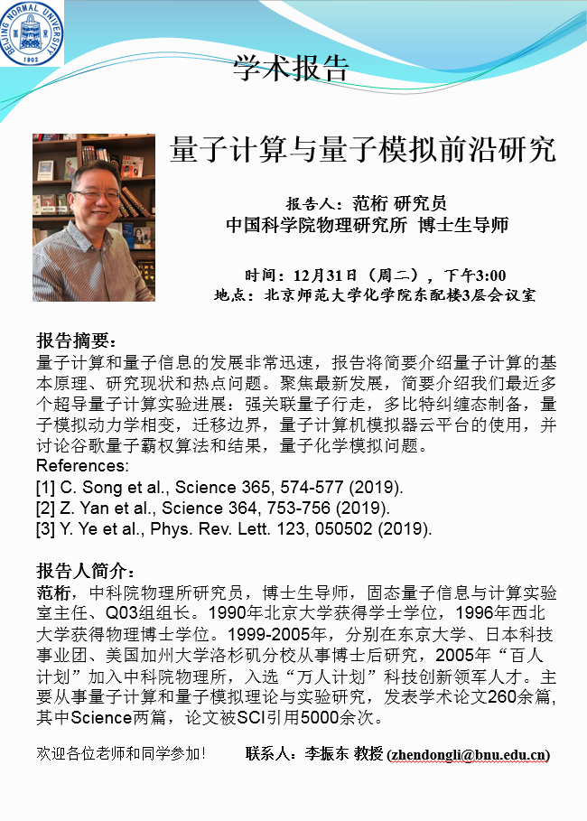 学术报告:中国科国产探花物理研究所,范桁研究员,量子计算与量子模拟前沿研究