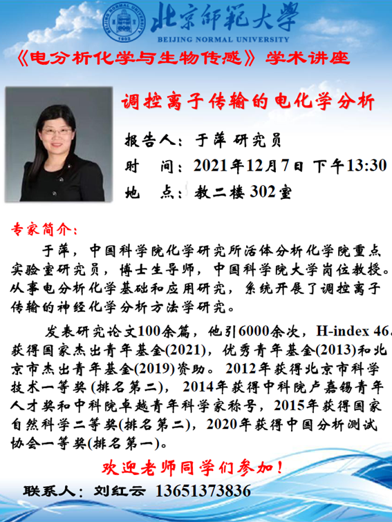 学术报告:中国科国产探花化学研究所,于萍 研究员,调控离子传输的电化学分析