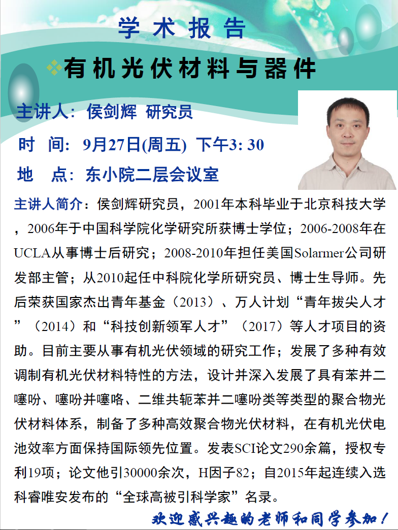 学术报告:中国科国产探花化学研究所,侯剑辉研究员,有机光伏材料与器件