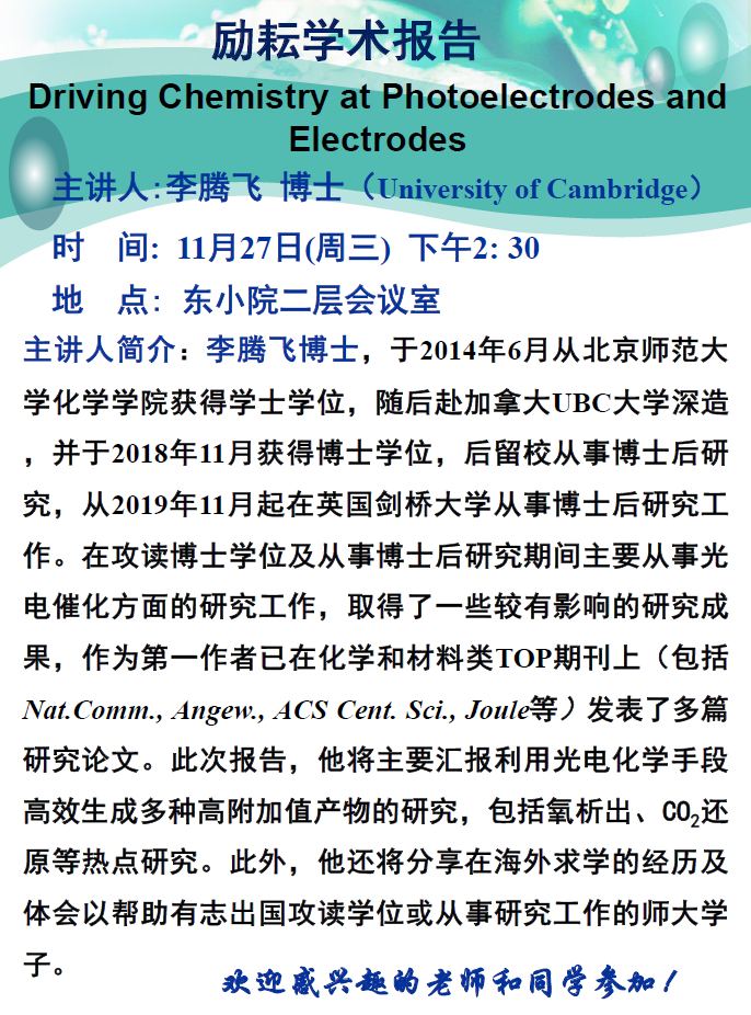 学术报告:英国剑桥大学,李腾飞博士,Driving Chemistry at Photoelectrodes and Electrodes