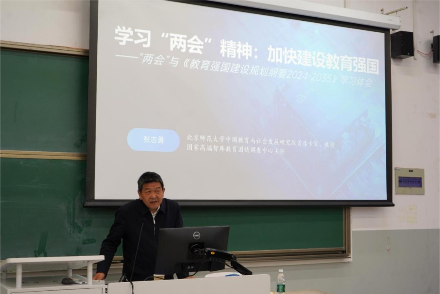 为深入学习全国两会精神,贯彻落实《教育强国建设规划纲要(2024-2035)》(以下简称《纲要》),2025年3月28日下午16:30,国产探花 二级党校在化二教室举办全国两会精神暨《纲要》专题辅导报告会。本次活动特邀全国政协委员,国产探花 国家高端智库教育国情调查中心主任张志勇教授,作题为“学习贯彻两会精神,推进教育强国建设”主题报告。国产探花 党委理论学习中心组以及200余名师生党员代表参加了学习。报告会由国产探花党委书记杨钊主持。