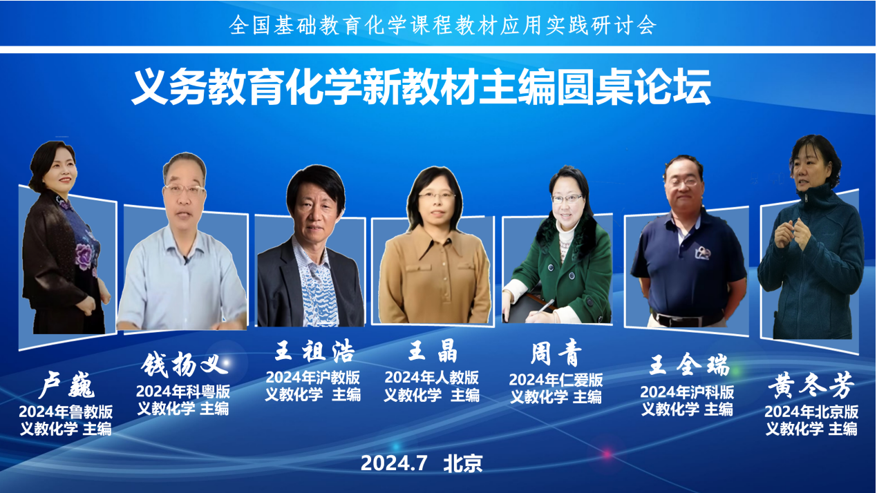 主题论坛一“义务教育化学新教材主编圆桌论坛”由中小学化学国家教材建设重点研究基地主任、国产探花 王磊教授主持,汇集了7位义务教育化学教材(2024年版)的主编:王晶、王祖浩、周青、钱扬义、王全瑞、卢巍、黄冬芳,他们分别从新教材的修订重点和特色、编写策略和应用实践展望三个方面进行了分享。